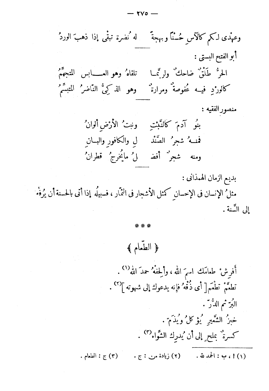 أفرش طعامك اسم الله، وألحفه حمد الله. تطعّم تطعم أي ذقه فإنه يدعوك إلى شهوته. البرّ ثم الدرّ. خبز الشعير يؤكل ويذمّ. كسرةٌ بملحٍ إلى أن يدرك الشواء.