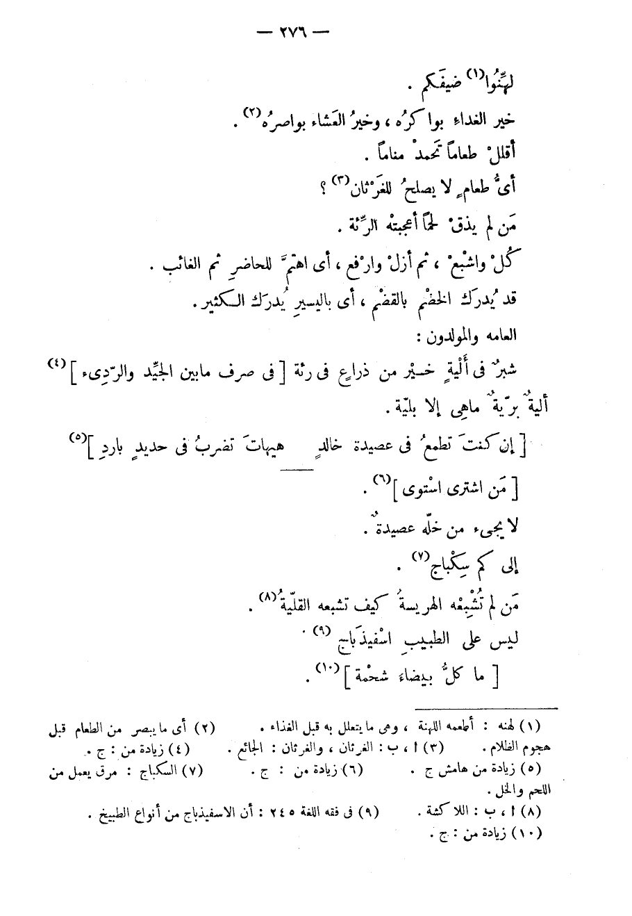 لهنّوا ضيفكم. خير الغداء بواكره، وخير العشاء بواصره. أقلل طعاماً تحمد مناماً. أيّ طعامٍ لا يصلح للغرثان؟. من لم يذق لحماً أعجبته الرئة. كل واشبع، ثم أزل وارفع، أي اهتم للحاضر ثم الغائب. قد يدرك الخضم بالقضم، أي باليسير يدرك الكثير. العامة والمولدون: شبرٌ في أليةٍ خيرٌ من ذراعٍ في رئة في صرف ما بين الجيد والرديء. أليّةٌ بريةٌ ما هي إلا بليةٌ.