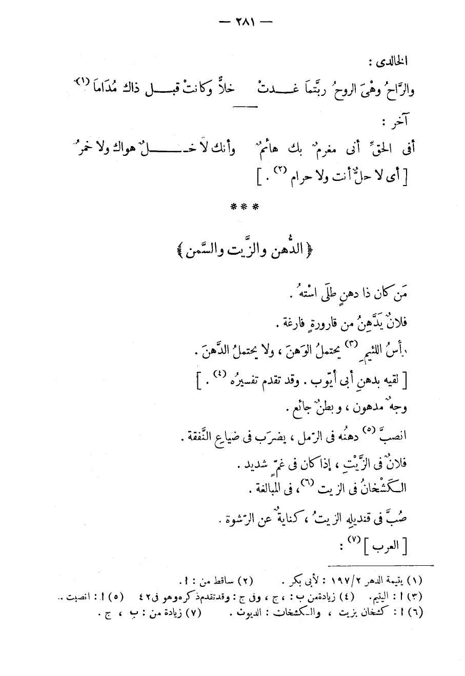 من كان ذا دهنٍ طلى استه. فلانٌ يدهن من قارورةٍ فارغة. رأس اللئيم يحتمل الوهن، ولا يحتمل الدهن. لقيه بدهن أبي أيوب. وقد تقدم تفسيره. وجهٌ مدهون، وبطنٌ جائع. انصب دهنه في الرمل، يضرب في ضياع النفقة. فلانٌ في الزيت، إذا كان في غمٍ شديد. الكشخان في الزيت، في المبالغة. صب في قنديله الزيت، كنايةٌ عن الرشوة. العرب: