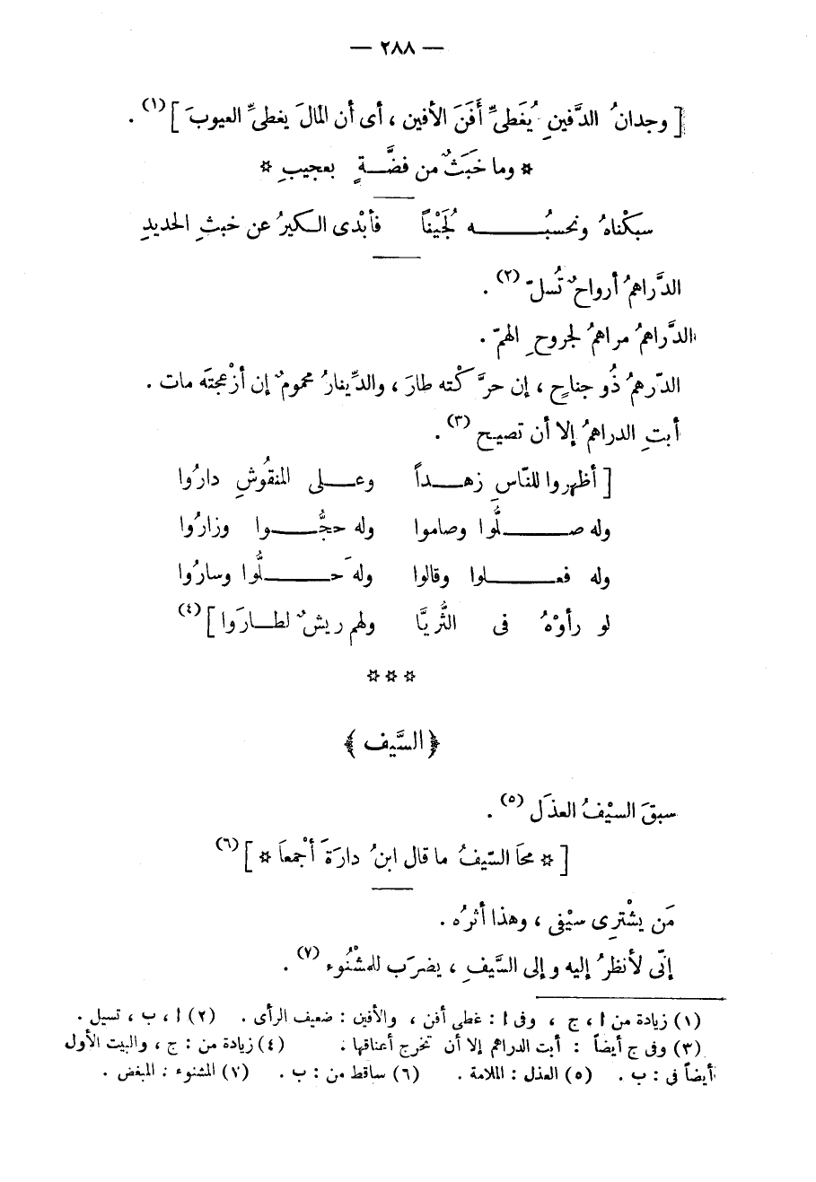 الدراهم أرواحٌ تسلّ. الدراهم مراهم لجروح الهمّ. الدرهم ذو جناحٍ، إن حركته طار، والدينار محمومٌ إن أزعجته مات. أبت الدراهم إلا أن تصيح.