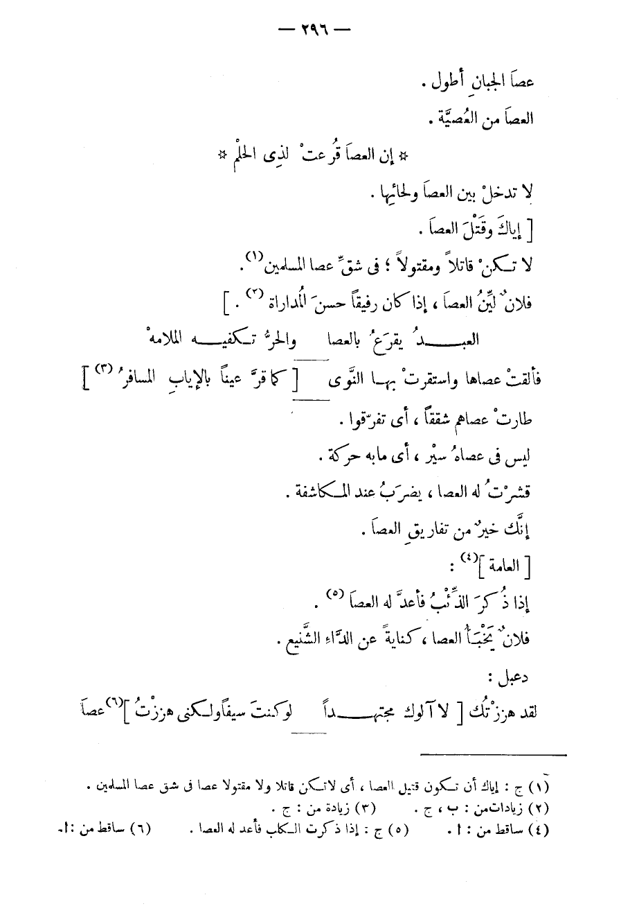 لا تدخل بين العصا ولحائها. إياك وقتل العصا. لا تكن قاتلاً ومقتولاً؛ في شق عصا المسلمين. فلانٌ لين العصا، إذا كان رفيقاً حسن المداراة.