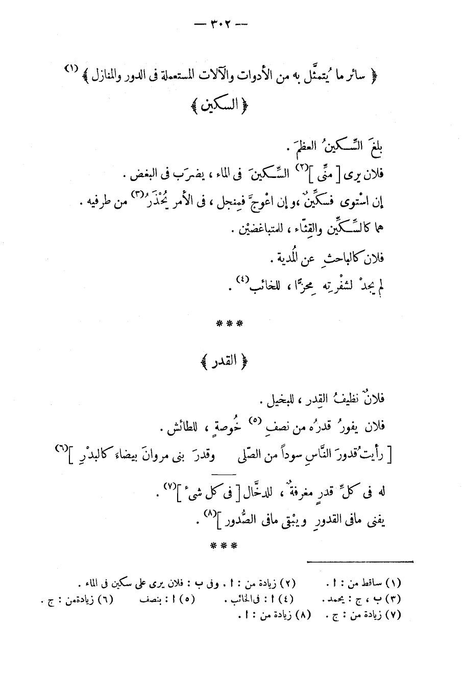 فلانٌ نظيف القدر، للبخيل. فلان يفور قدره من نصف خوصةٍ، للطائش.