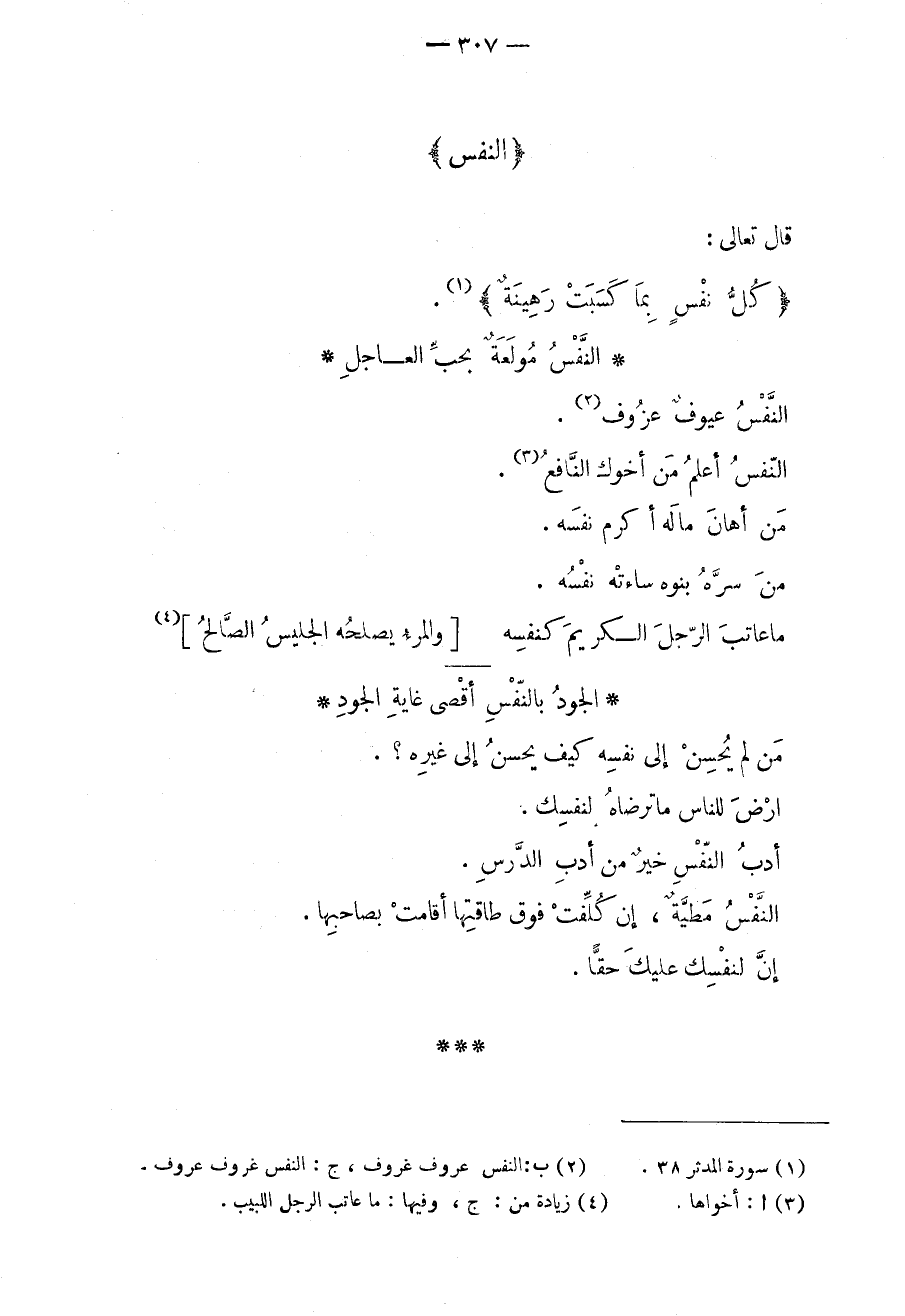 من لم يحسن إلى نفسه كيف يحسن إلى غيره؟. ارض للناس ما ترضاه لنفسك. أدب النفس خيرٌ من أدب الدرس. النفس مطيةٌ، إن كلفت فوق طاقتها أقامت بصاحبها. إن لنفسك عليك حقاً.