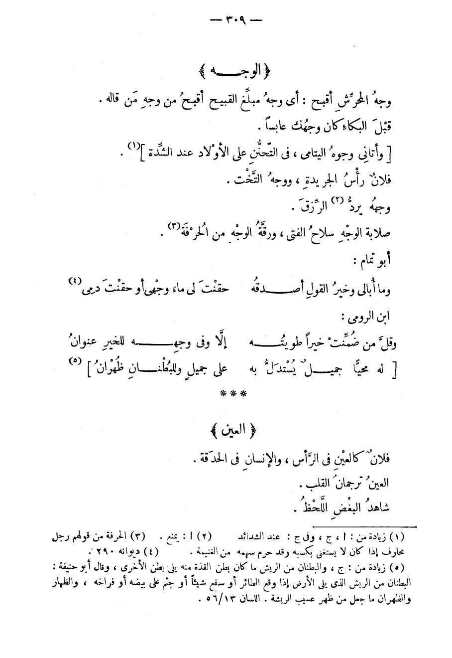 وجه المحرش أقبح: أي وجه مبلغ القبيح أقبح من وجه من قاله. قبل البكاء كان وجهك عابساً. وأتاني وجوه اليتامى، في التحنن على الأولاد عند الشدة. فلانٌ رأس الجريدة، ووجه التخت. وجهه يرد الرزق. صلابة الوجه سلاح الفتى، ورقة الوجه من الحرفة. أبو تمام: