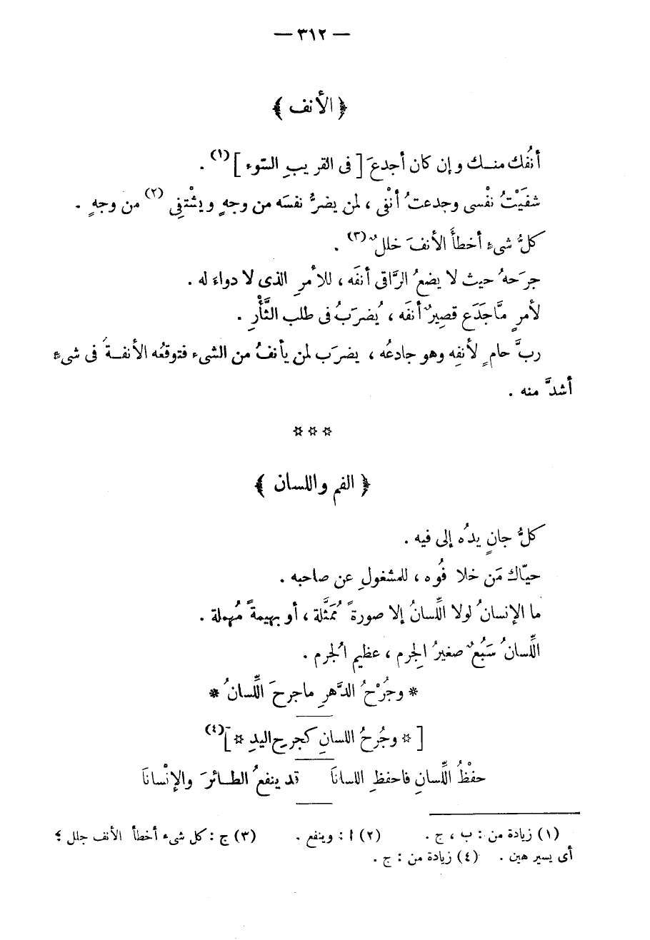 كل جانٍ يده إلى فيه. حياك من خلا فوه، للمشغول عن صاحبه. ما الإنسان لولا اللسان إلا صورةً ممثلة، أو بهيمةً مهملة. اللسان سبعٌ صغير الجرم، عظيم الجرم.