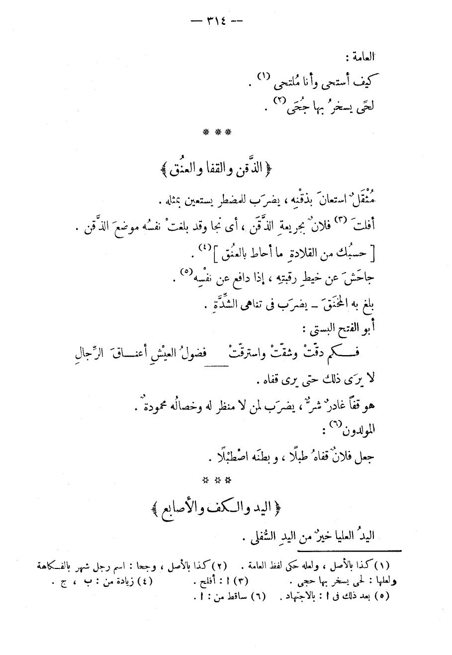 مثقلٌ استعان بذقنه، يضرب للمضطر يستعين بمثله. أفلت فلانٌ بجريعة الذقن، أي نجا وقد بلغت نفسه موضع الذقن. حسبك من القلادة ما أحاط بالعنق. جاحش عن خيط رقبته، إذا دافع عن نفسه. بلغ به المخنق - يضرب في تناهي الشدة. أبو الفتح البستي: