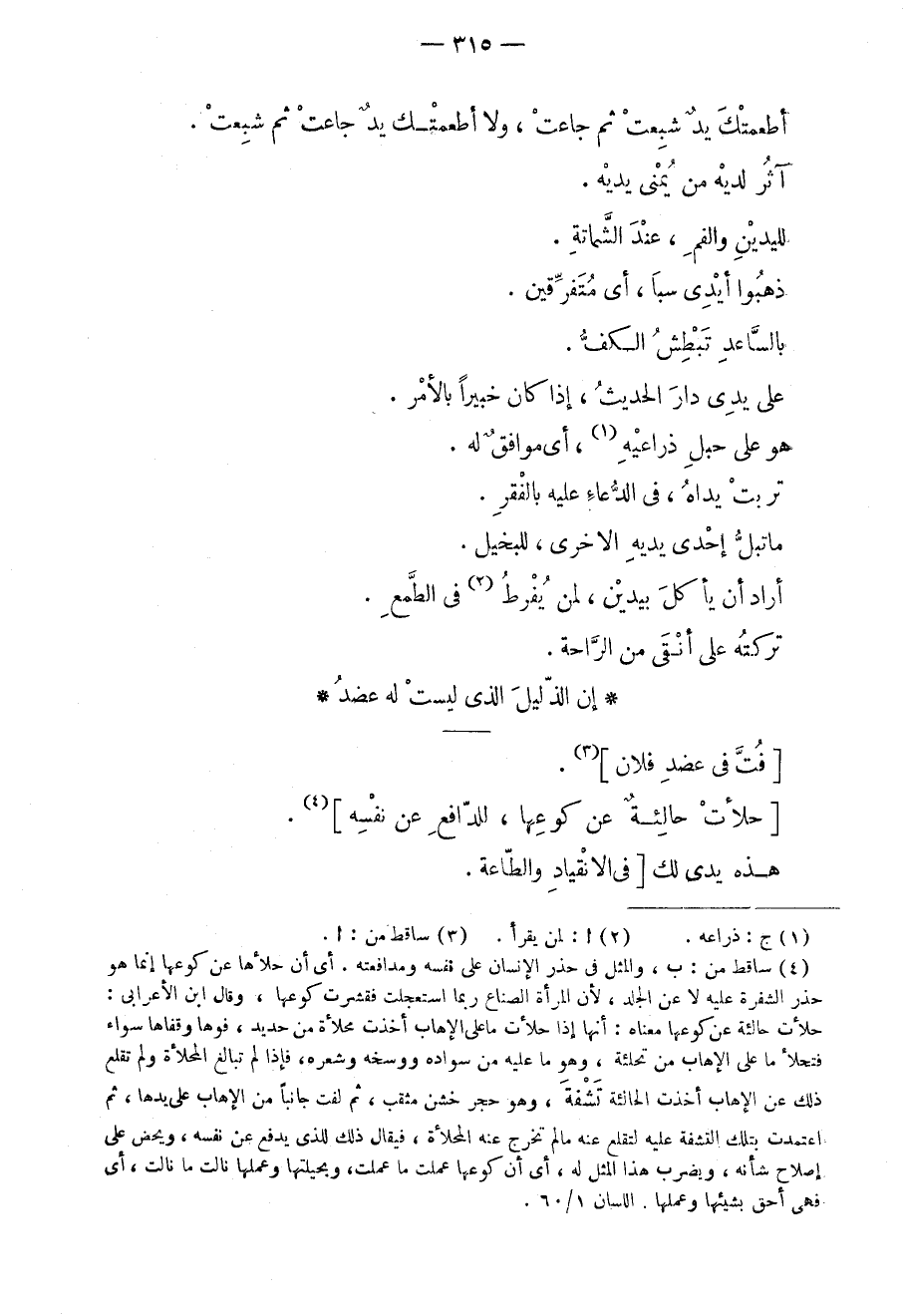 فتّ في عضد فلان. حلأت حالئة عن كوعها، للدافع عن نفسه. هذه يدي لك في الإنقياد والطاعة.