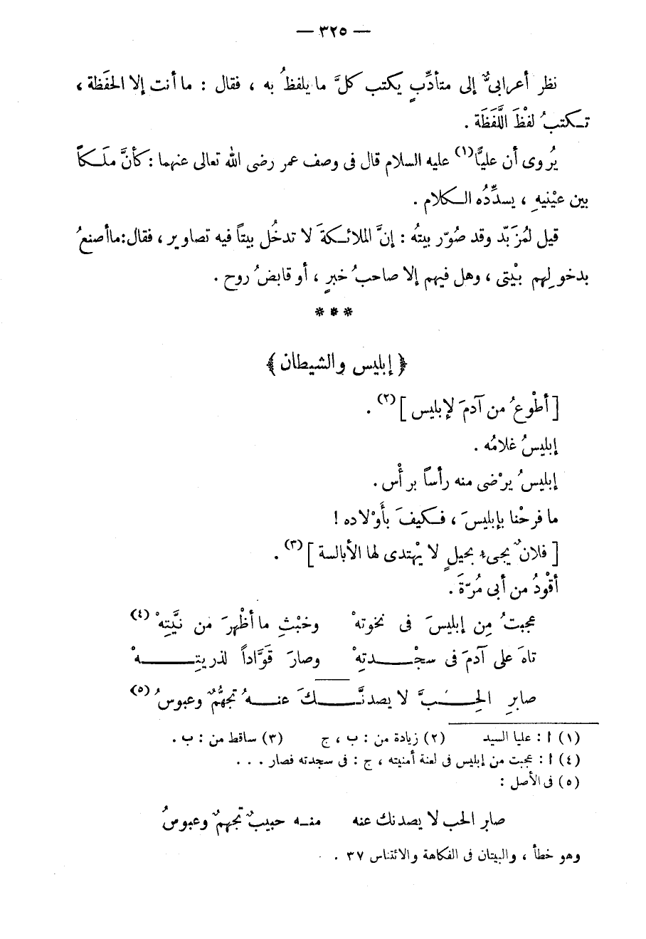 نظر أعرابيٌ إلى متأدبٍ يكتب كل ما يلفظ به، فقال: ما أنت إلا الحفظة، تكتب لفظ اللفظة. يروى أن علياً عليه السلام قال في وصف عمر رضي الله تعالى عنهما: كأن ملكاً بين عينيه، يسدده الكلام. قيل لمزبد وقد صور بيته: إن الملائكة لا تدخل بيتاً فيه تصاوير، فقال: ما أصنع بدخولهم بيتي، وهل فيهم إلا صاحب خبرٍ، أو قابض روح.