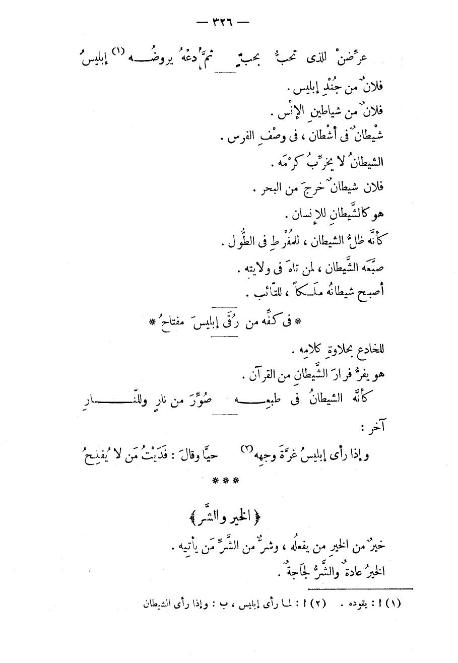 فلانٌ من جند إبليس. فلانٌ من شياطين الإنس. شيطانٌ في أشطان، في وصف الفرس. الشيطان لا يخرب كرمه. فلان شيطانٌ خرج من البحر. هو كالشيطان للإنسان. كأنه ظل الشيطان، للمفرط في الطول. صبعه الشيطان، لمن تاه في ولايته. أصبح شيطانه ملكاً، للتائب.