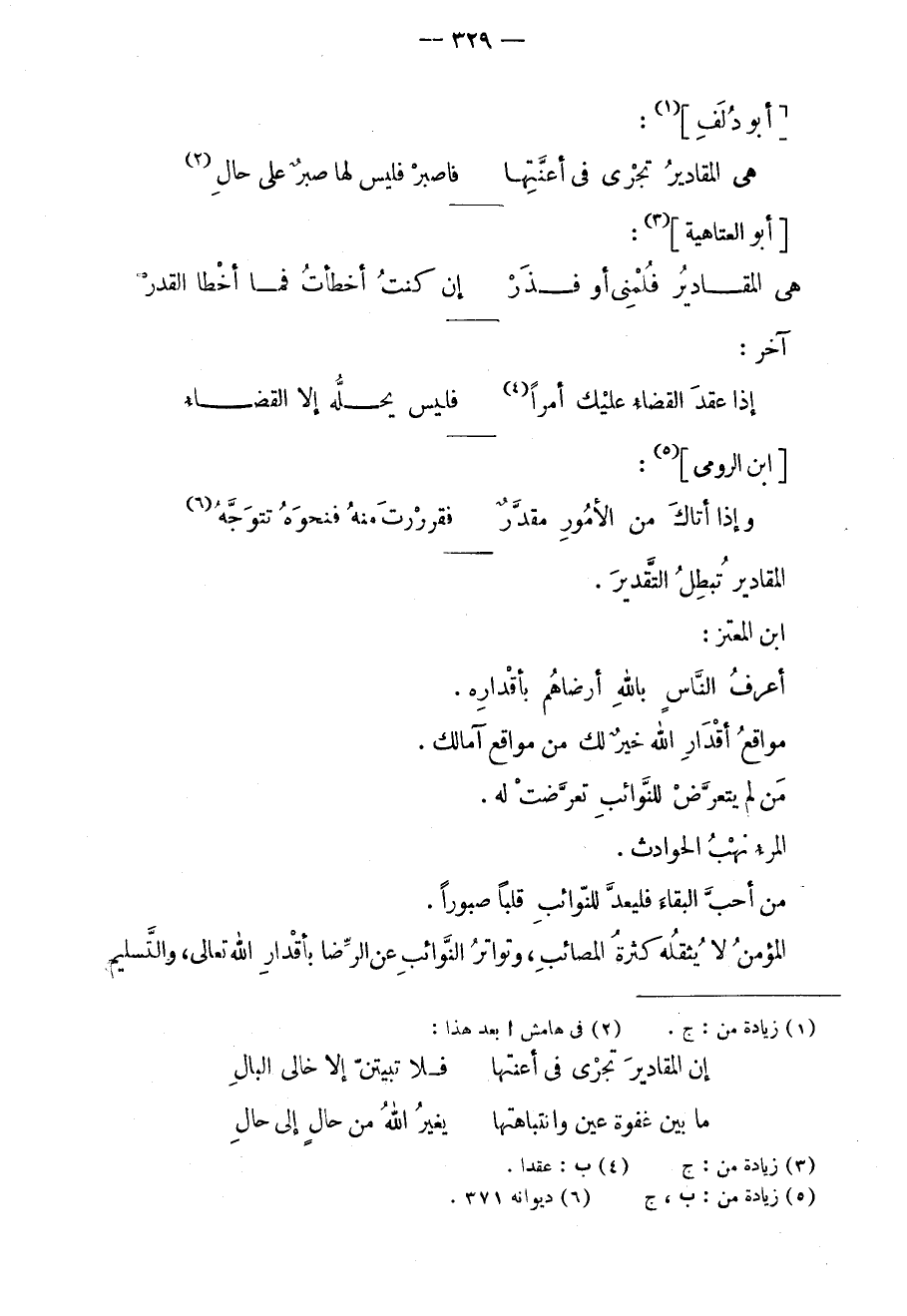 المقادير تبطل التقدير. ابن المعتز: أعرف الناس بالله أرضاهم بأقداره. مواقع أقدار الله خيرٌ لك من مواقع آمالك. من لم يتعرض للنوائب تعرضت له. المرء نهب الحوادث. من أحب البقاء فليعد للنوائب قلباً صبوراً. المؤمن لا يثقله كثرة المصائب، وتواتر النوائب عن الرضا بأقدار الله تعالى، والتسليم
