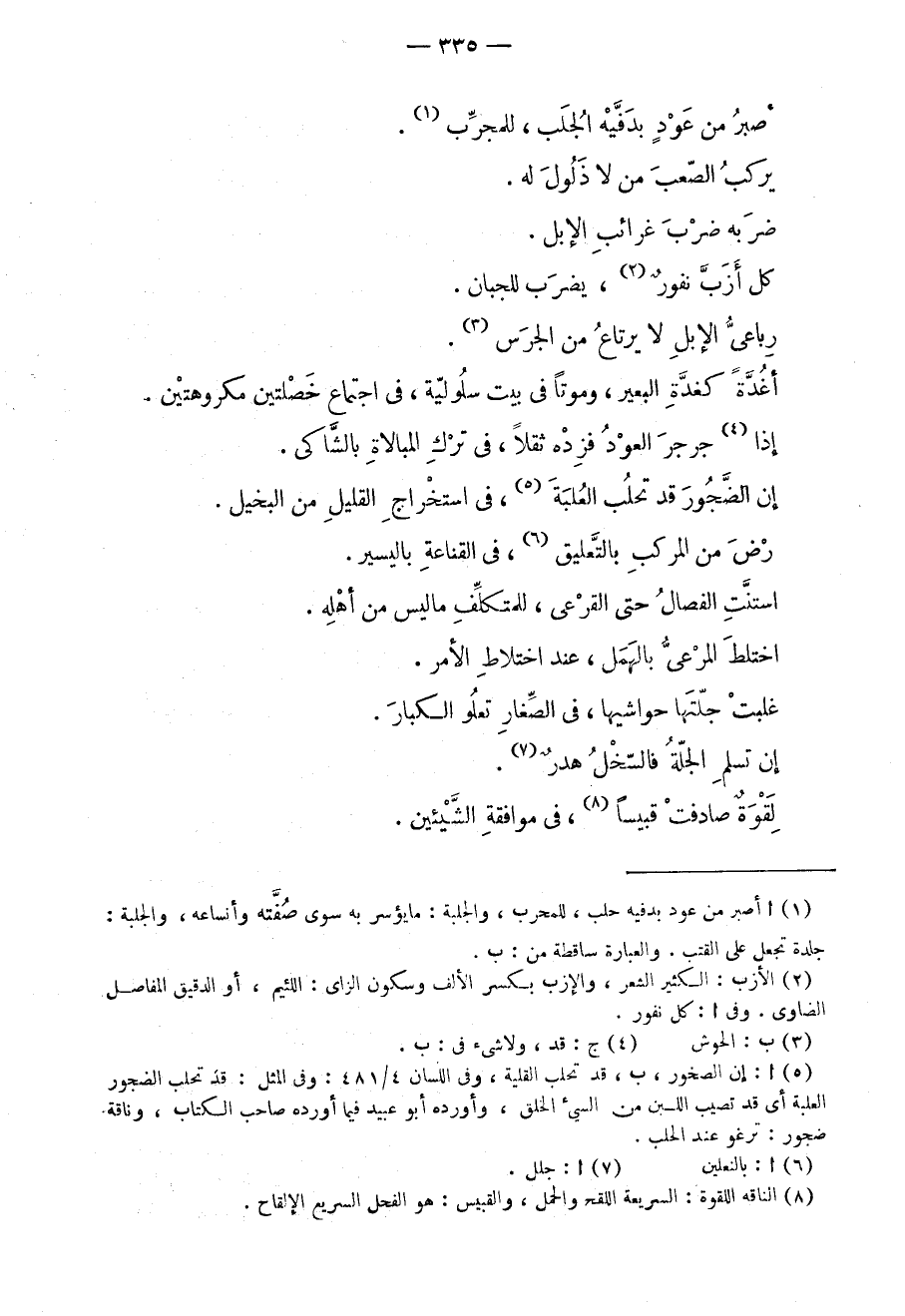 صبر من عودٍ بدفيه الجلب، للمجرب. يركب الصعب من لا ذلول له. ضربه ضرب غرائب الإبل. كل أزبّ نفورٌ، يضرب للجبان. رباعي الإبل لا يرتاع من الجرس. أغدةً كغدة البعير، وموتاً في بيت سلولية، في اجتماع خصلتين مكروهتين. إذا جرجر العود فزده ثقلاً، في ترك المبالاة بالشاكي. إن الضجور قد تحلب العلبة، في استخراج القليل من البخيل. رض من المركب بالتعليق، في القناعة باليسير. استنت الفصال حتى القرعى، للمتكلف ما ليس من أهله. اختلط المرعى بالهمل، عند اختلاط الأمر. غلبت جلتها حواشيها، في الصغار تعلو الكبار. إن تسلم الجلة فالسخل هدرٌ. لقوةٌ صادفت قبيساً، في موافقة الشيئين.