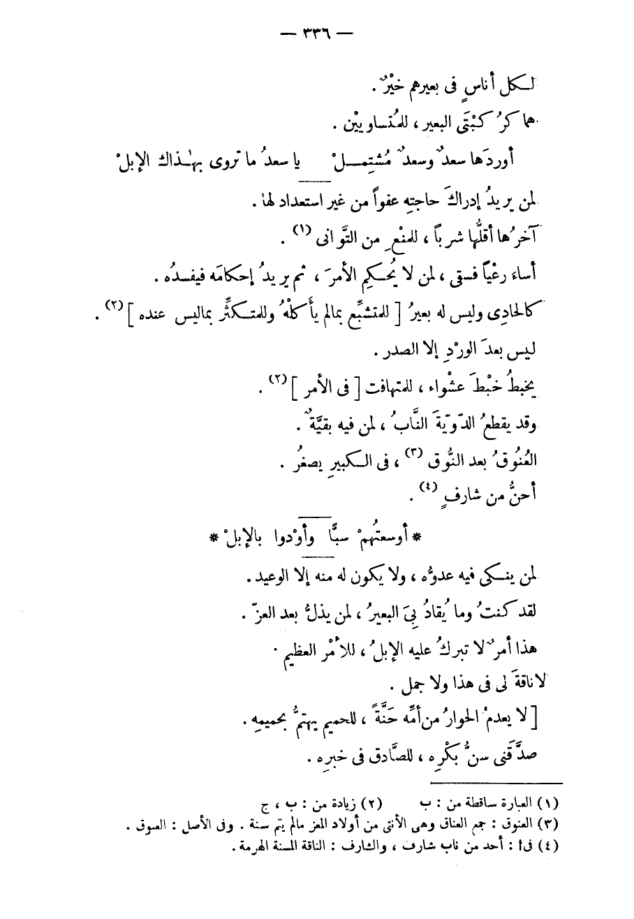 لمن يريد إدراك حاجته عفواً من غير استعداد لها. آخرها أقلها شرباً، للمنع من التواني. أساء رعياً فسقى، لمن لا يحكم الأمر، ثم يريد إحكامه فيفسده. كالحادي وليس له بعير، للمتشبع بما لم يأكله وللمتكثر بما ليس عنده. ليس بعد الورد إلا الصدر. يخبط خبط عشواء، للمتهافت في الأمر. وقد يقطع الدوية الناب، لمن فيه بقيةٌ. العنوق بعد النوق، في الكبير يصغر. أحنّ من شارفٍ.