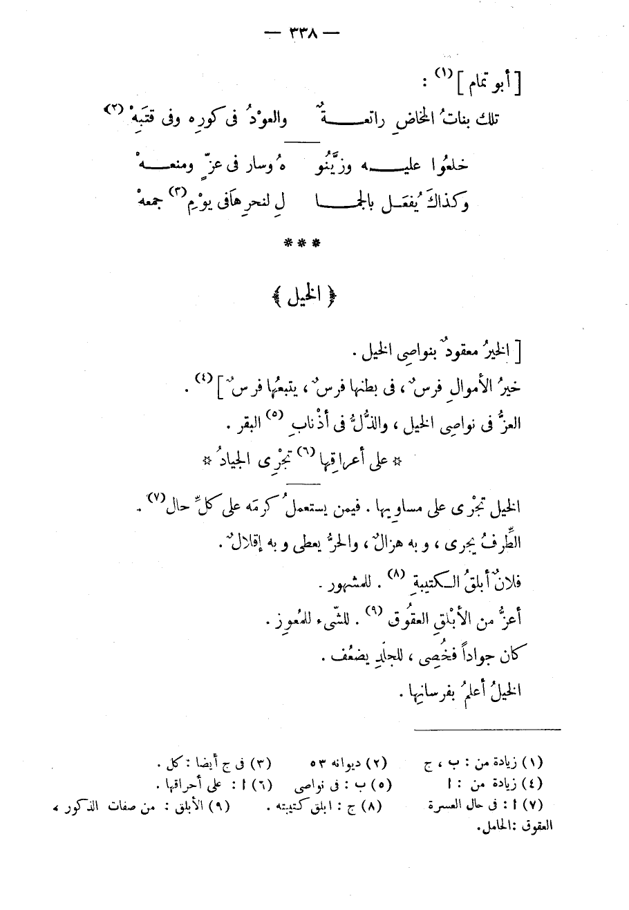الخير معقودٌ بنواصي الخيل. خير الأموال فرسٌ، في بطنها فرسٌ، يتبعها فرسٌ. العزّ في نواصي الخيل، والذل في أذناب البقر.
