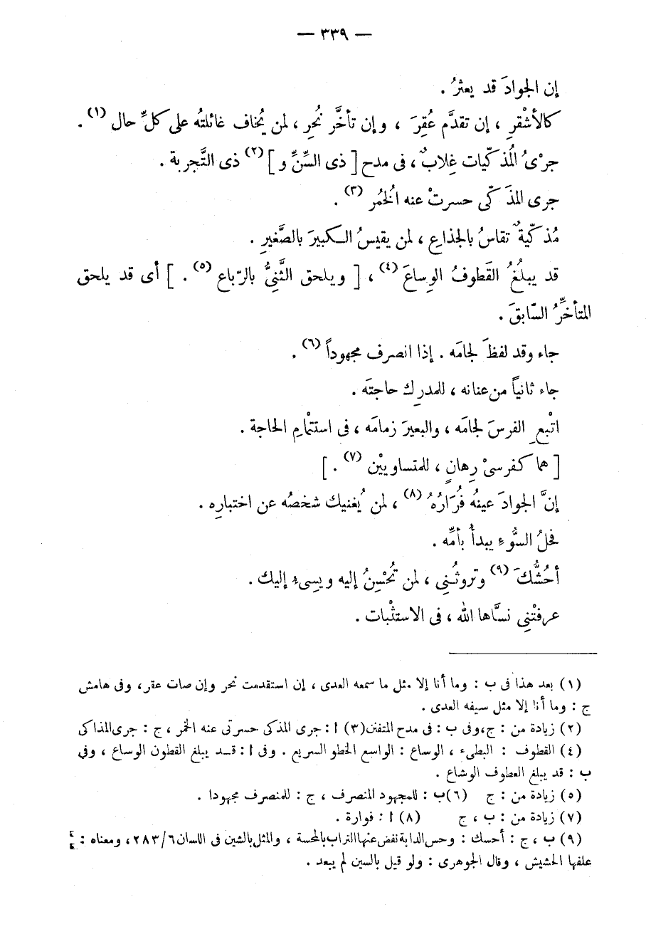 إن الجواد قد يعثر. كالأشقر، إن تقدم عقر، وإن تأخر نحر، لمن يخاف غائلته على كل حال. جري المذكيات غلابٌ، في مدح ذي السن وذي التجربة. جرى المذكى حسرت عنه الخمر. مذكيةٌ تقاس بالجذاع، لمن يقيس الكبير بالصغير. قد يبلغ القطوف الوساع، ويلحق الثني بالرباع، أي قد يلحق المتأخر السابق. جاء وقد لفظ لجامه. إذا انصرف مجهوداً. جاء ثانياً من عنانه، للمدرك حاجته. اتبع الفرس لجامه، والبعير زمامه، في استتمام الحاجة. هما كفرسي رهانٍ، للمتساوين. إن الجواد عينه فراره، لمن يغنيك شخصه عن اختباره. فحل السوء يبدأ بأمه. أحشك وتروثني، لمن تحسن إليه ويسيء إليك. عرفتني نساها الله، في الاستثبات.