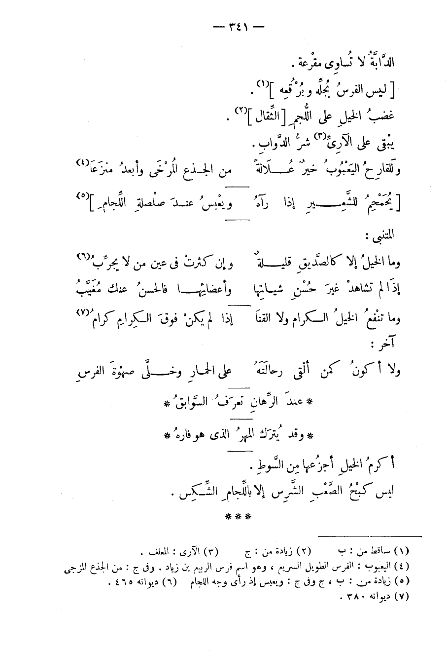 الدابة لا تساوي مقرعة. ليس الفرس بجله وبرقعه. غضب الخيل على اللجم الثقال. يبقى على الآريّ شر الدواب.