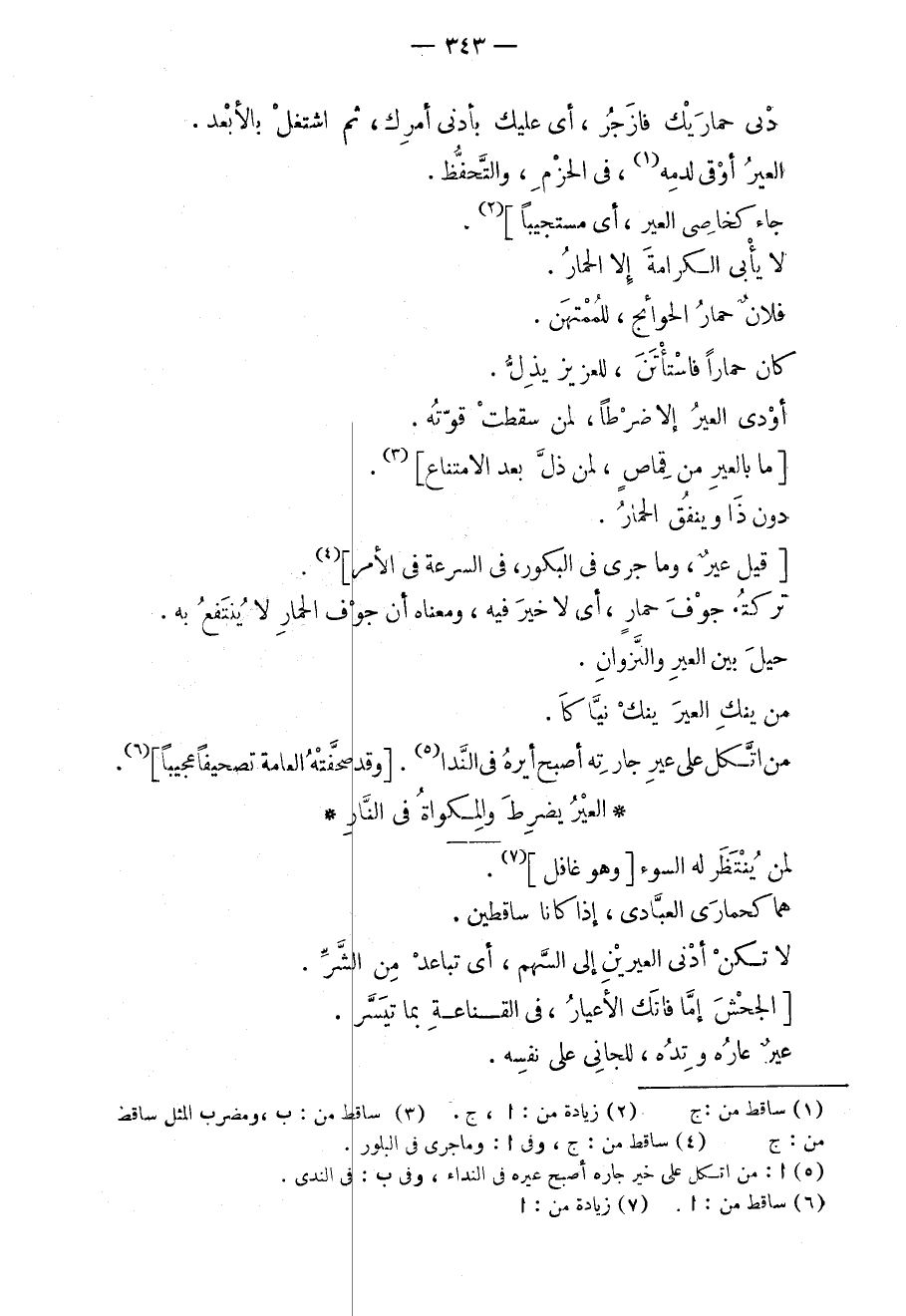 دني حماريك فازجر، أي عليك بأدنى أمرك، ثم اشتغل بالأبعد. العير أوقى لدمه، في الحزم، والتحفظ. جاء كخاصي العير، أي مستجيباً. لا يأبى الكرامة إلا الحمار. فلانٌ حمار الحوائج، للممتهن. كان حماراً فاستأتن، للعزيز يذل. أودى العير إلا ضرطاً، لمن سقطت قوته. ما بالعير من قماصٍ، لمن ذل بعد الامتناع. دون ذا وينفق الحمار. قيل عيرٌ، وما جرى في البكور، في السرعة في الأمر. تركته جوف حمارٍ، أي لا خير فيه، ومعناه أن جوف الحمار لا ينتفع به. حيل بين العير والنزوان. من ينك العير ينك نياكاً. من اتكل على عير جارته أصبح أيره في الندا. وقد صحفته العامة تصحيفاً عجيباً.