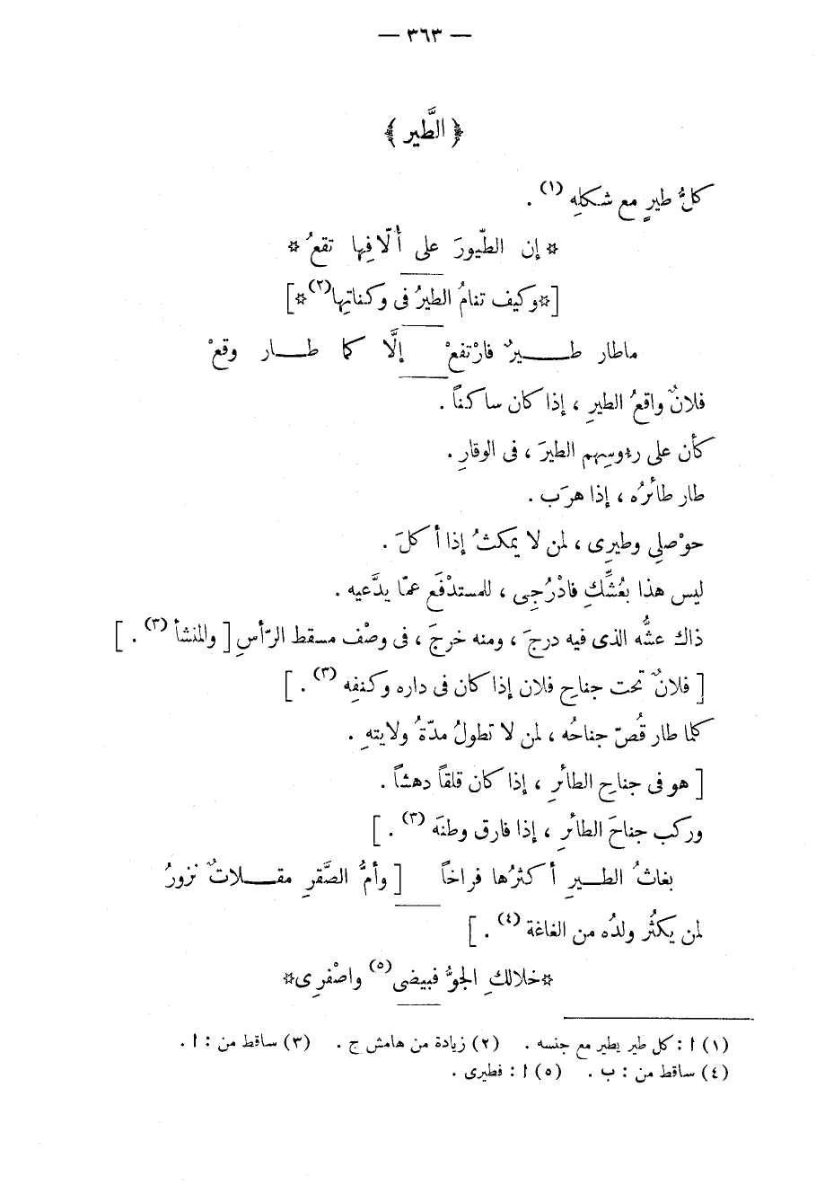 فلانٌ واقع الطير، إذا كان ساكناً. كأن على رؤوسهم الطير، في الوقار. طار طائره، إذا هرب. حوصلي وطيري، لمن لا يمكث إذا أكل. ليس هذا بعشك فادرجي، للمستدفع عما يدعيه. ذاك عشه الذي فيه درج، ومنه خرج، في وصف مسقط الرأس والمنشأ. فلانٌ تحت جناح فلان إذا كان في داره وكنفه. كلما طار قص جناحه، لمن لا تطول مدة ولايته. هو في جناح الطائر، إذا كان قلقاً دهشاً. وركب جناح الطائر، إذا فارق وطنه.