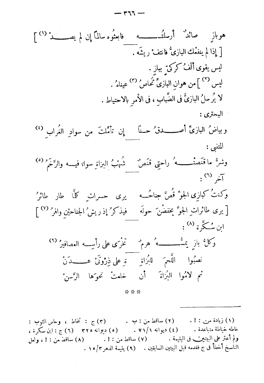 إذا لم ينفعك البازي فانتف ريشه. ليس يقوى ألف كركيٍ ببازٍ. ليس من هوان البازي تحاص عيناه. لا يرسل البازي في الضباب، في الأمر بالاحتياط. البحتري: