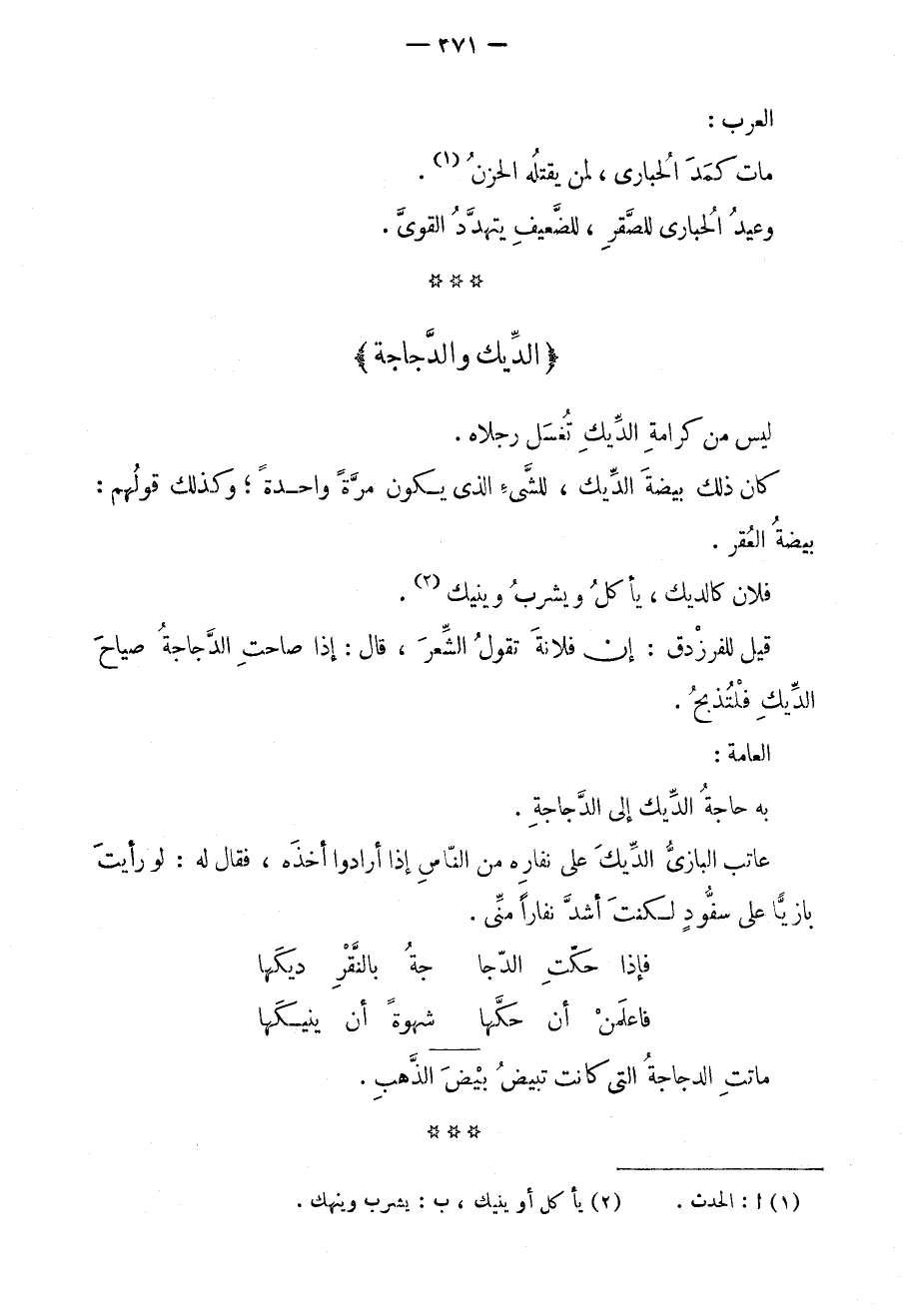 ليس من كرامة الديك تغسل رجلاه. كان ذلك بيضة الديك، للشيء الذي يكون مرةً واحدةٌ؛ وكذلك قولهم، بيضة العقر. فلان كالديك، يأكل ويشرب وينيك. قيل للفرزدق: إن فلانة تقول الشعر، قال: إذا صاحت الدجاجة صياح الديك فلتذبح. العامة: به حاجة الديك إلى الدجاجة. عاتب البازي الديك على نفاره من الناس إذا أرادوا أخذه، فقال له: لو رأيت بازياً على سفودٍ لكنت أشد نفوراً مني.