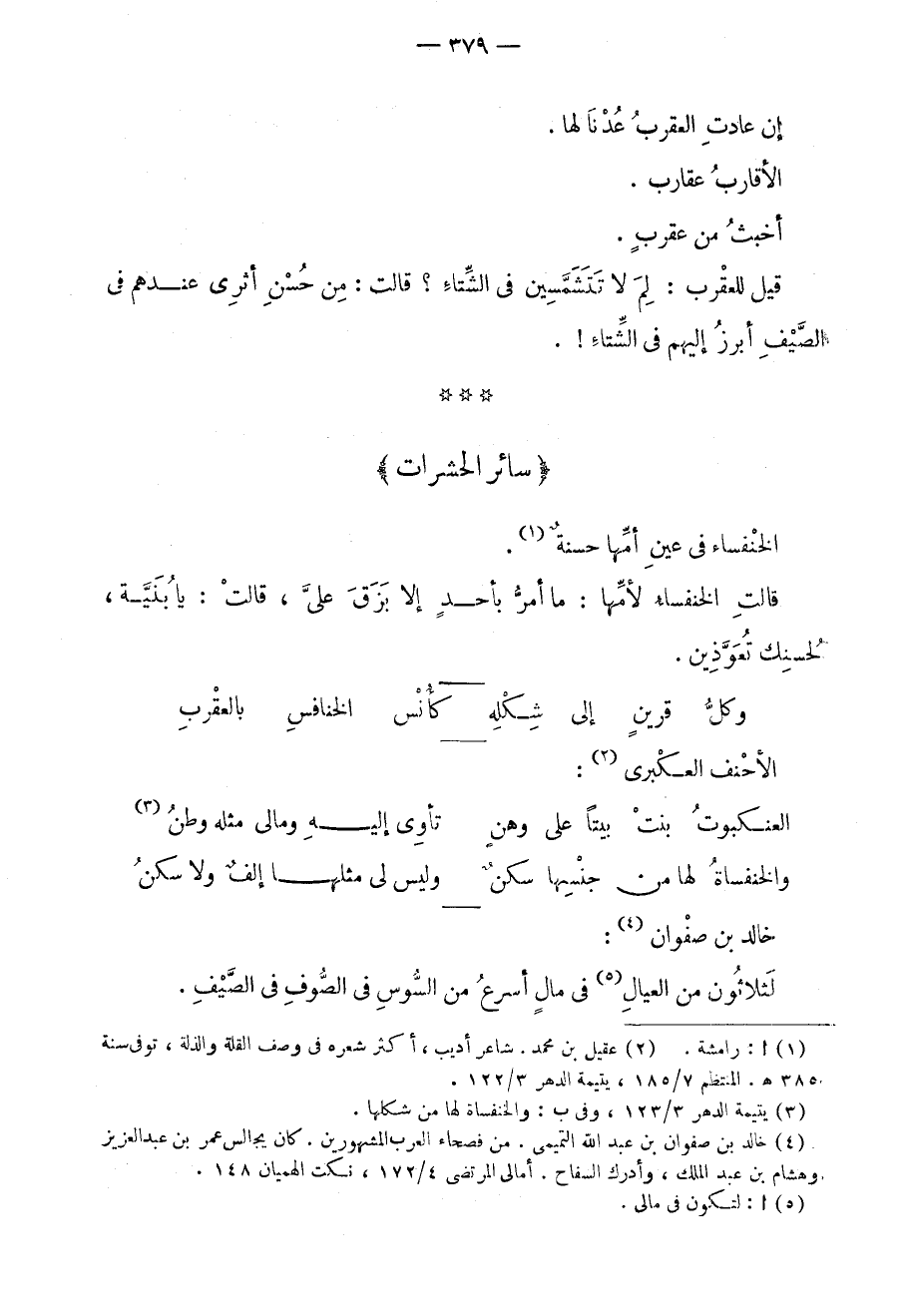 إن عادت العقرب عدنا لها. الأقارب عقارب. أخبث من عقربٍ. قيل للعقرب: لم لا تتشمسين في الشتاء؟ قالت: من حسن أثري عندهم في الصيف أبرز إليهم في الشتاء.