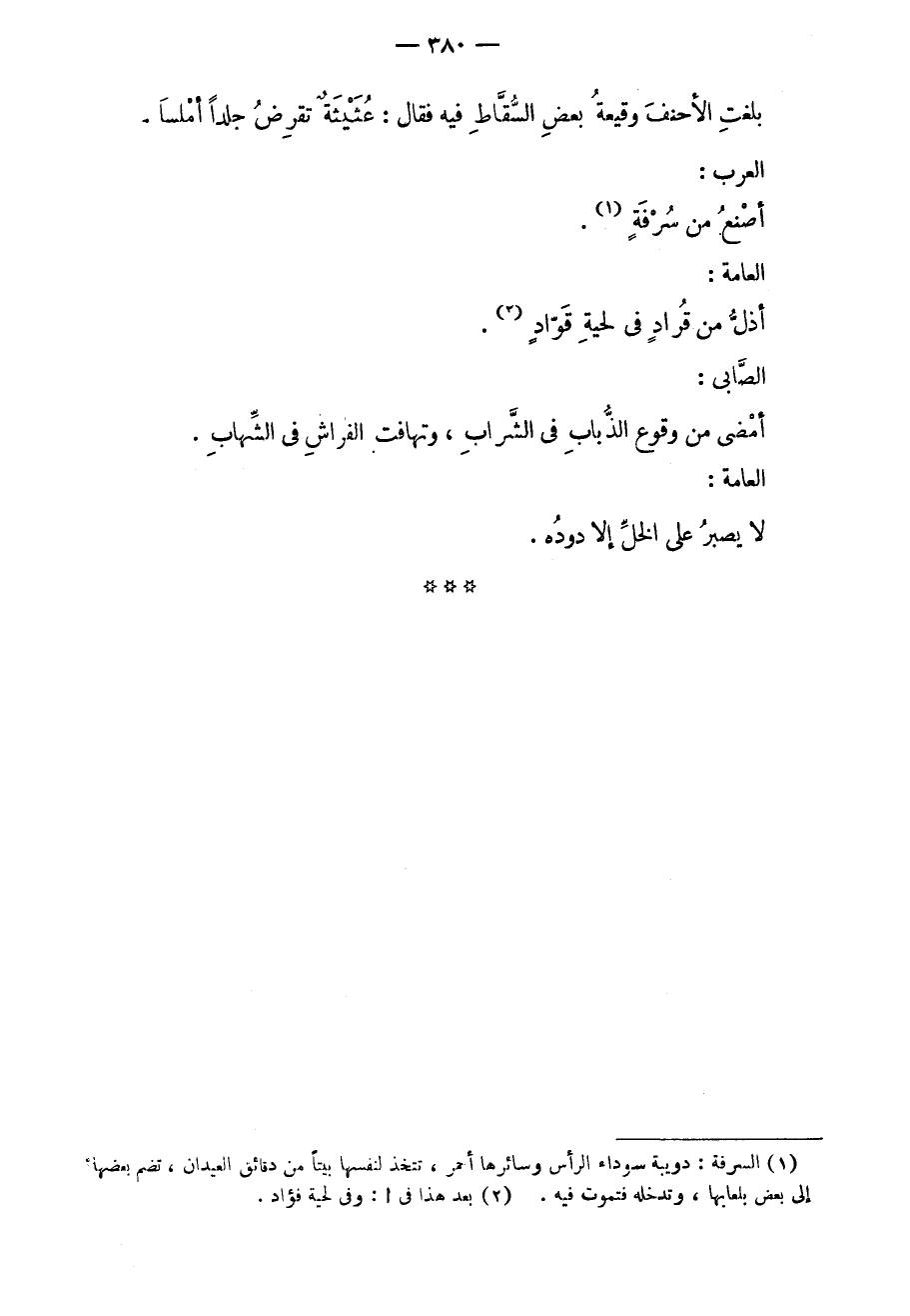 بلغت الأحنف وقيعة بعض السقاط فيه فقال: عثيثةٌ تقرض جلداً أملساً. العرب: أصنع من سرفةٍ. العامة: أذل من قرادٍ في لحية قواد. الصابي: أمضى من وقوع الذباب في الشراب، وتهافت الفراش في الشهاب. العامة: لا يصبر على الخل إلا دوده.