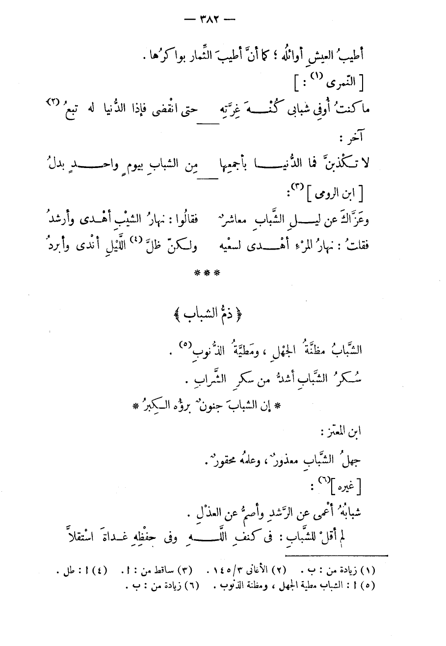 ابن المعتز: جهل الشباب معذورٌ، وعلمه محقورٌ. غيره: شبابه أعمى عن الرشد وأصم عن العذل.