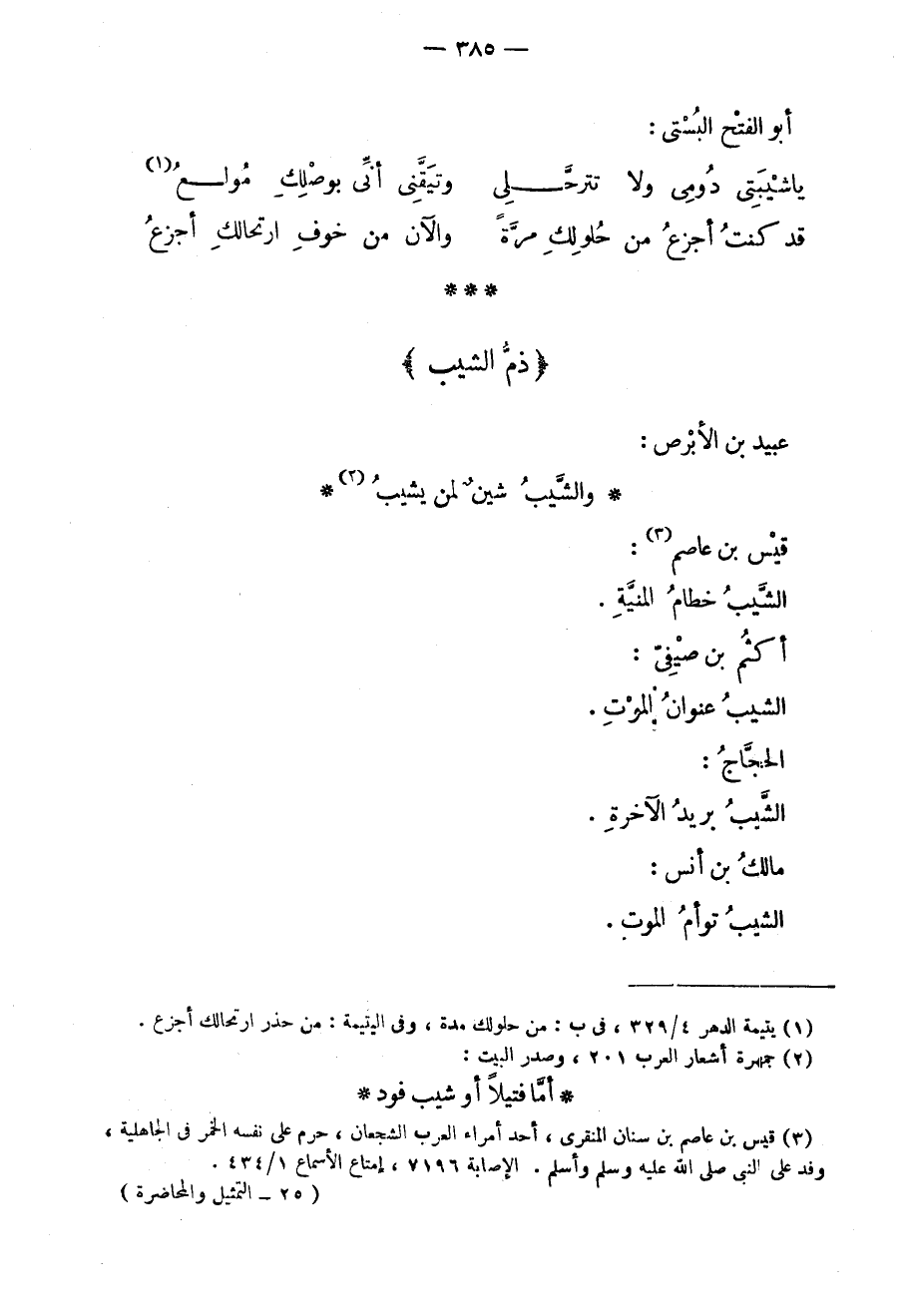 قيس بن عاصم: الشيب خطام المنية. أكثم بن صيفي: الشيب عنوان الموت. الحجاج: الشيب بريد الآخرة. مالك بن أنس: الشيب توأم الموت.