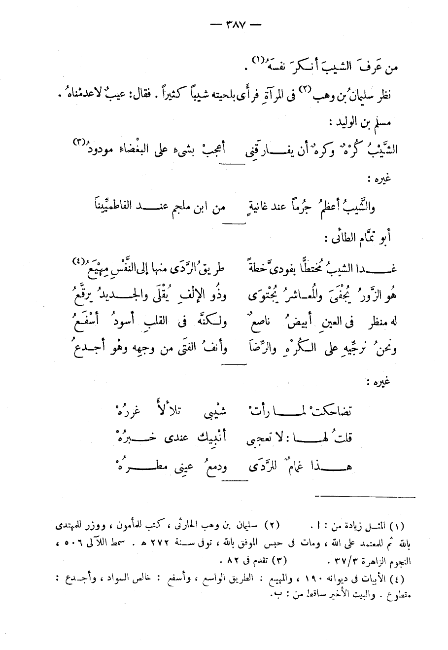 من عرف الشيب أنكر نفسه. نظر سليمان بن وهب في المرآة فرأى بلحيته شيباً كثيراً. فقال: عيبٌ لا عدمناه. مسلم بن الوليد: