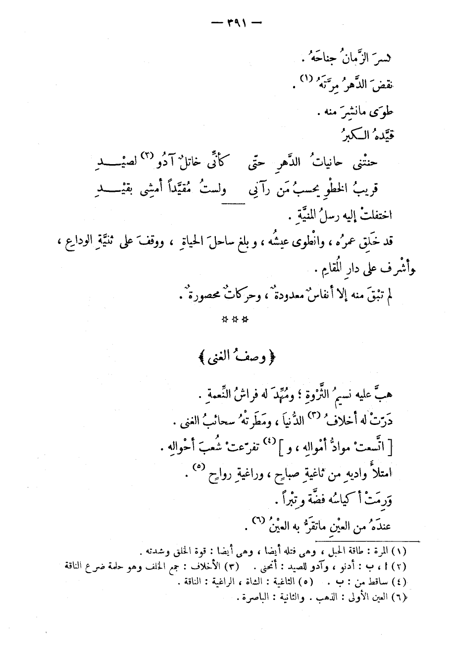 اختلفت إليه رسل المنية. قد خلق عمره، وانطوى عيشه، وبلغ ساحل الحياة، ووقف على ثنية الوداع، وأشرف على دار المقام. لم تبق منه إلا أنفاسٌ معدودةٌ، وحركاتٌ محصورةٌ.