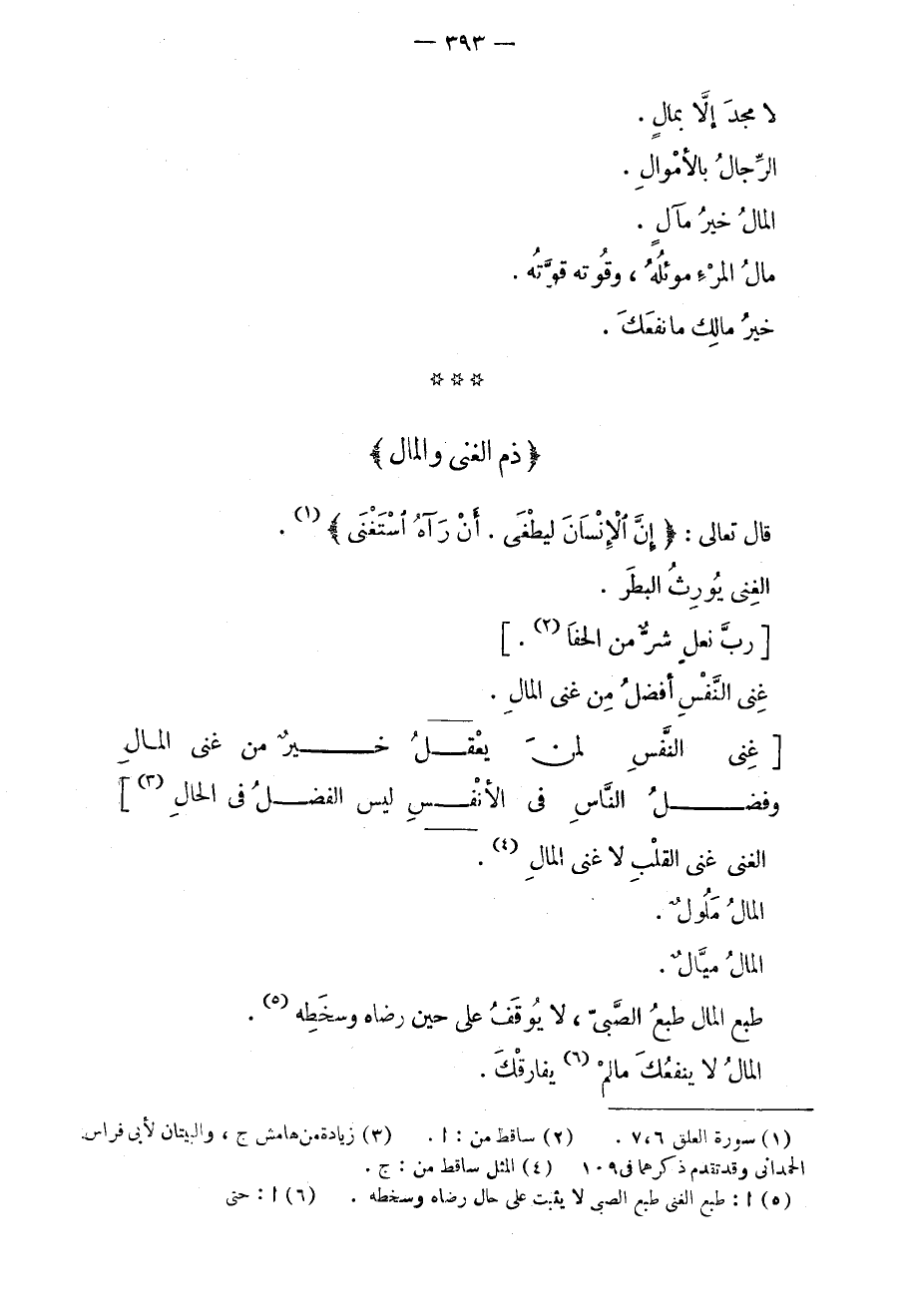 الغنى غنى القلب لا غنى المال. المال ملولٌ. المال ميالٌ. طبع المال طبع الصبي، لا يوقف على حين رضاه وسخطه. المال لا ينفعك ما لم يفارقك.