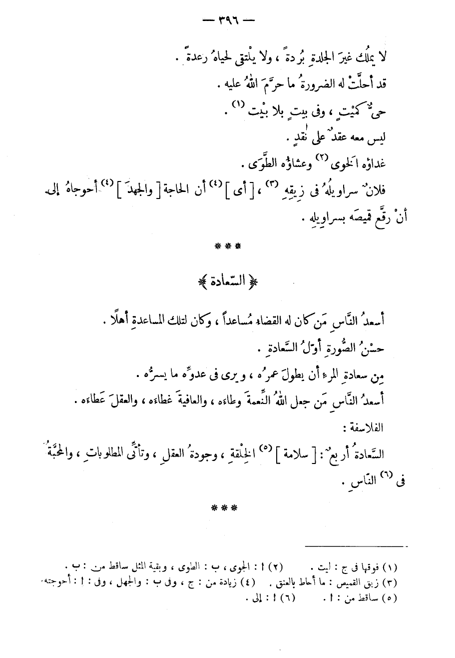 أسعد الناس من كان له القضاء مساعداً، وكان لتلك المساعدة أهلاً. حسن الصورة أول السعادة. من سعادة المرء أن يطول عمره، ويرى في عدوه ما يسره. أسعد الناس من جعل الله النعمة وطاءه، والعافية غطاءه، والعقل عطاءه. الفلاسفة: السعادة أربعٌ: سلامة الخلقة، وجودة العقل، وتأتي المطلوبات، والمحبة في الناس.