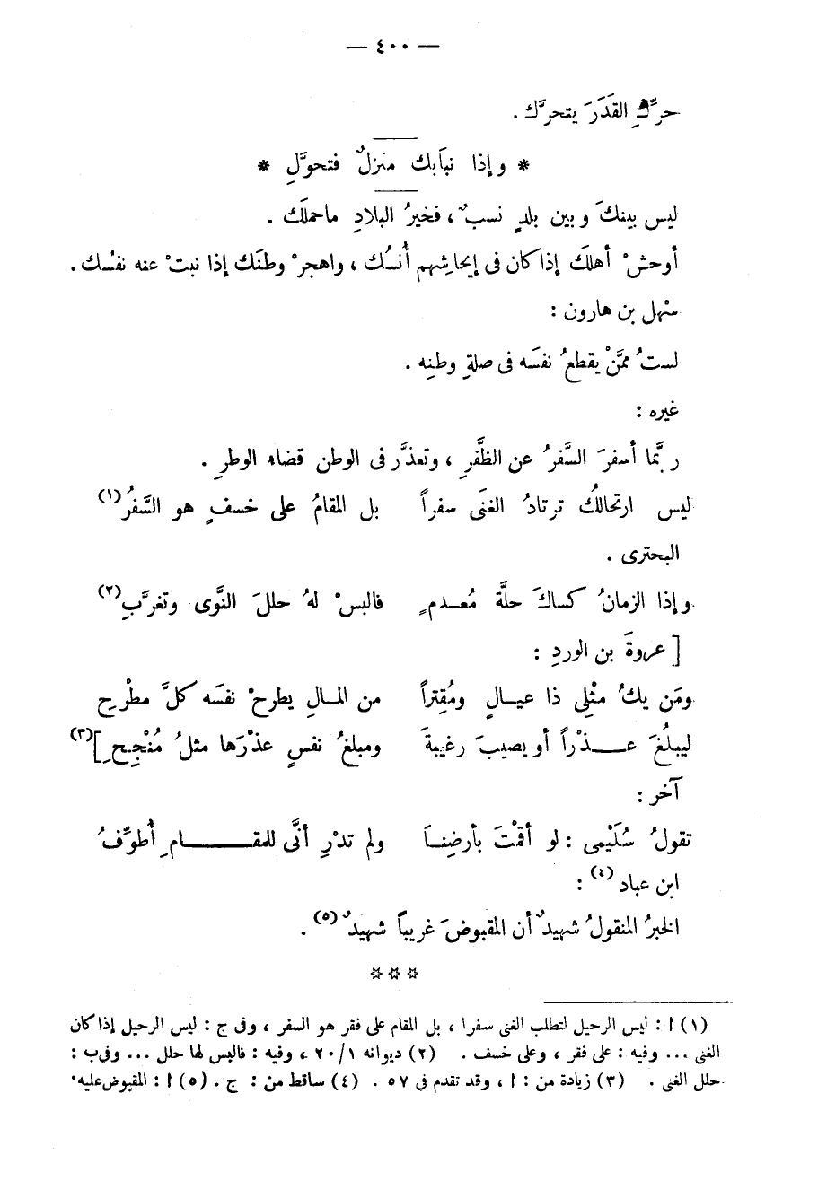 ليس بينك وبين بلدٍ نسبٌ، فخير البلاد ما حملك. أوحش أهلك إذا كان في إيحاشهم أنسك، واهجر وطنك إذا نبت عنه نفسك. سهل بن هارون: لست ممن يقطع نفسه في صلة وطنه. غيره: ربما أسفر السفر عن الظفر، وتعذر في الوطن قضاء الوطر.