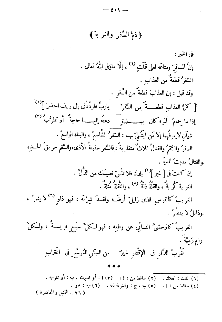 شيئان لا يعرفهما إلا من ابتلي بهما: السفر الشاسع، والبناء الواسع. السفر والسقم والقتال ثلاثٌ متقاربةٌ، فالسفر سفينة الأذى، والسقم حريق الجسد، والقتال منبت المنايا. إذا كنت في غير بلدك فلا تنس نصيبك من الذل. الغربة كربةٌ، والقلة ذلة، والنقلة مثلة. الغريب كالفرس الذي زايل أرضه وفقد شربه، فهو ذاوٍ لا يثمر، وذابلٍ لا ينضر. الغريب كالوحشي النائي عن وطنه، فهو لكل سبعٍ فريسةٌ، ولكل رامٍ رميةٌ.