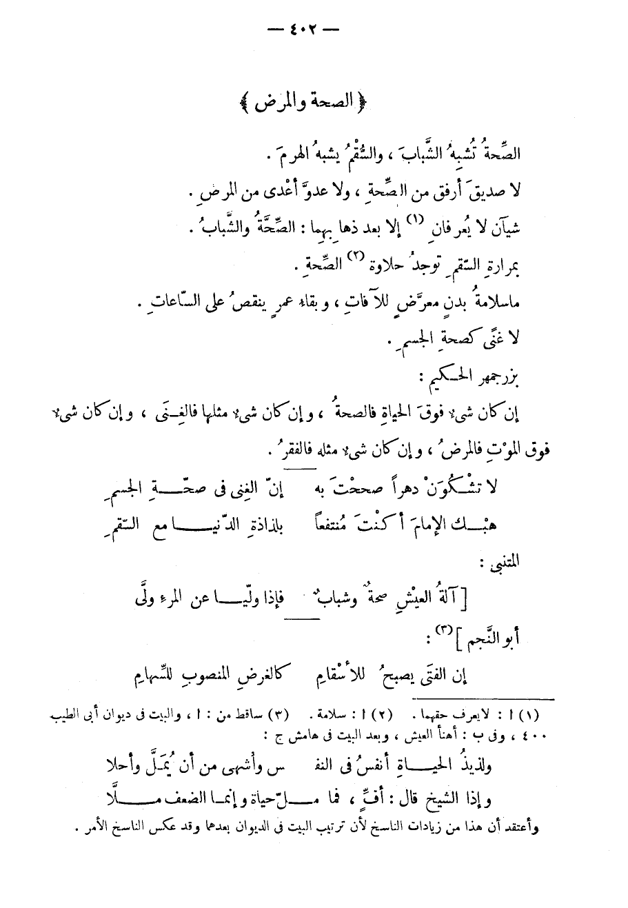 الصحة تشبه الشباب، والسقم يشبه الهرم. لا صديق أرفق من الصحة، ولا عدو أعدى من المرض. شيئان لا يعرفان إلا بعد ذهابهما: الصحة والشباب. بمرارة السقم توجد حلاوة الصحة. ما سلامة بدنٍ معرضٍ للآفات، وبقاء عمرٍ ينقص على الساعات. لا غنىً كصحة الجسم. بزرجمهر الحكيم: إن كان شيءٌ فوق
