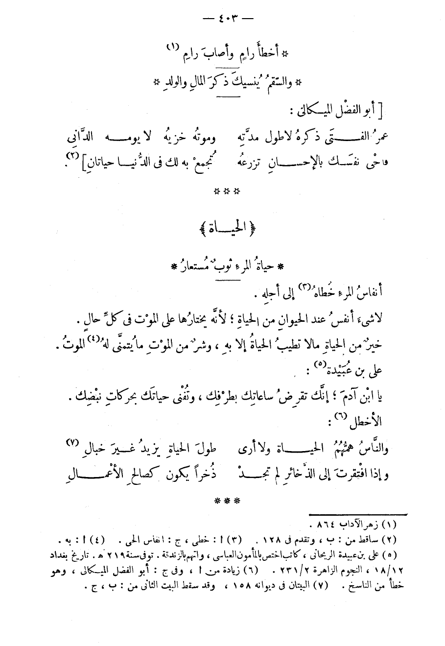 أنفاس المرء خطاه إلى أجله. لا شيء أنفس عند الحيوان من الحياة؛ لأنه يختارها على الموت في كل حالٍ. خيرٌ من الحياة ما لا تطيب الحياة إلا به، وشرٌ من الموت ما يتمنى له الموت. علي بن عبيدة: يا ابن آدم؛ إنك تقرض ساعاتك بطرفك، وتفني حياتك بحركات نبضك. الأخطل: