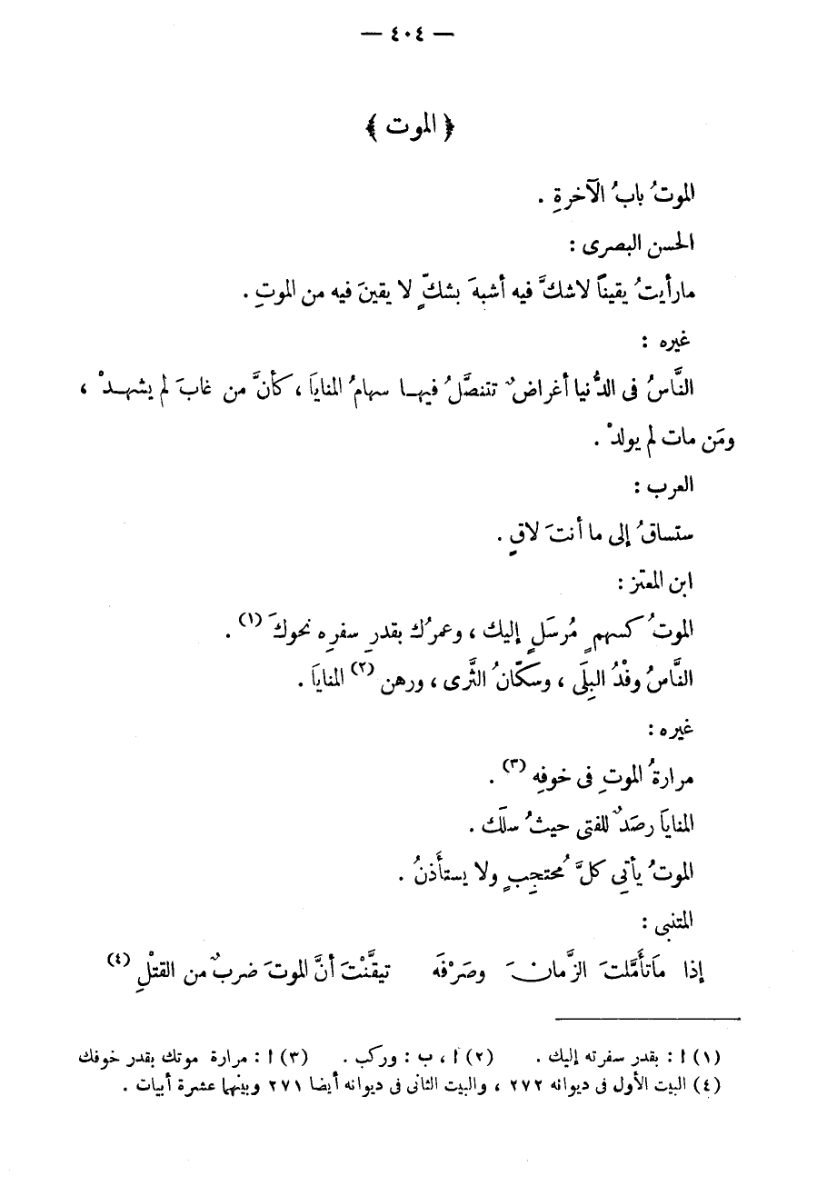 الموت باب الآخرة. الحسن البصري: ما رأيت يقيناً لا شك فيه أشبه بشكٍ لا يقين فيه من الموت. غيره: الناس في الدنيا أغراضٌ تتنصل فيها سهام المنايا، كأن من غاب لم يشهد، ومن مات لم يولد. العرب: ستساق إلى ما أنت لاقٍ. ابن المعتز: الموت كسهمٍ مرسلٍ إليك، وعمرك بقدر سفره نحوك. الناس وفد البلى، وسكان الثرى، ورهن المنايا. غيره: مرارة الموت في خوفه. المنايا رصدٌ للفتى حيث سلك. الموت يأتي كل محتجبٍ ولا يستأذن. المتنبي: