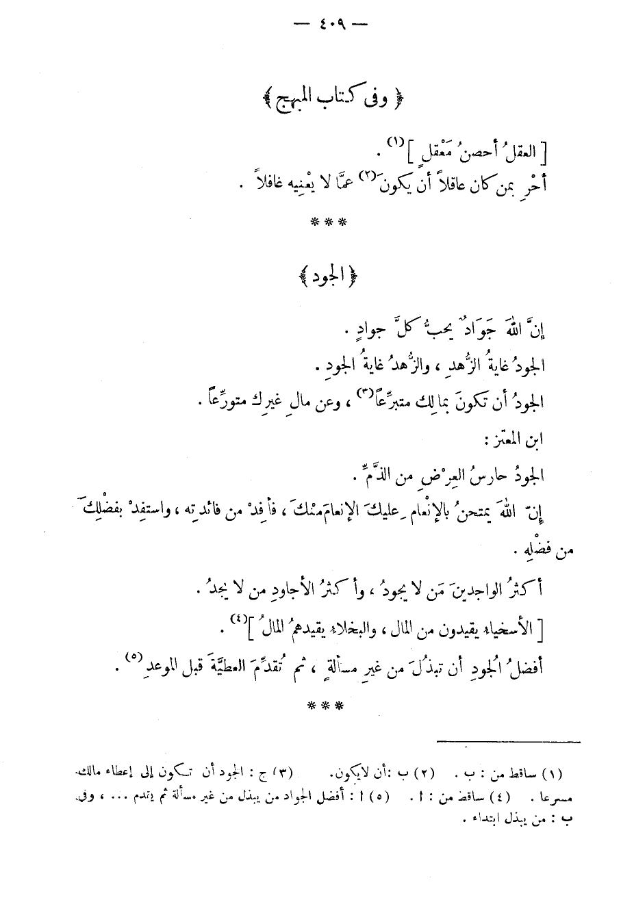 إن الله جوادٌ يحب كل جوادٍ. الجود غاية الزهد، والزهد غاية الجود. الجود أن تكون بما لك متبرعاً، وعن مال غيرك متورعاً. ابن المعتز: الجود حارس العرض من الذم. إن الله يمتحن بالإنعام عليك الإنعام منك، فأفد من فائدته، واستفد بفضلك من فضله. أكثر الواجدين من لا يجود، وأكثر الأجاود من لا يجد. الأسخياء يقيدون من المال، والبخلاء يقيدهم المال. أفضل الجود أن تبذل من غير مسألةٍ، ثم تقدم العطية قبل الموعد.