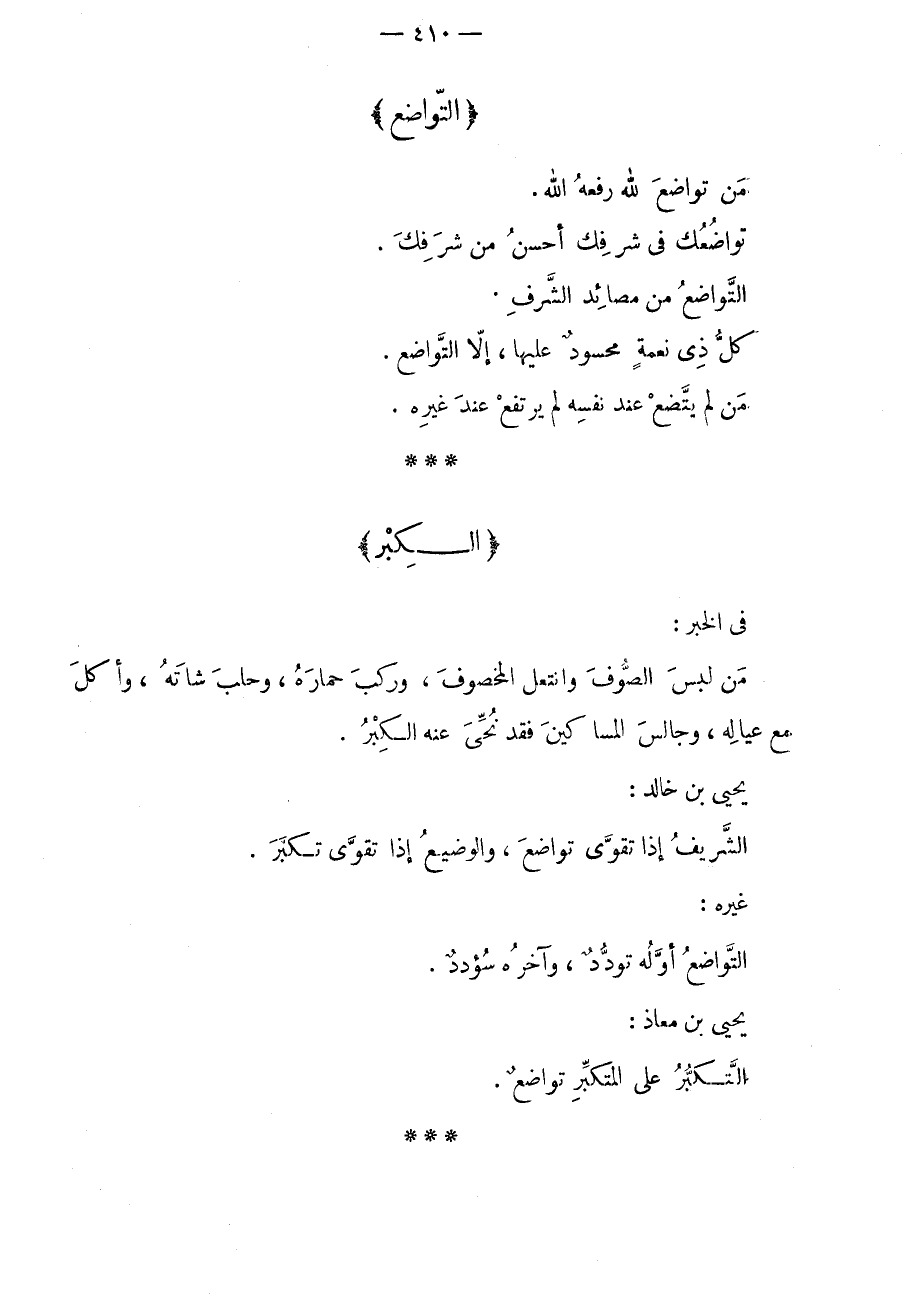 في الخبر: من لبس الصوف وانتعل المخصوف، وركب حماره، وحلب شاته، وأكل مع عياله، وجالس المساكين فقد نحي عنه الكبر. يحيى بن خالد: الشريف إذا تقوى تواضع، والوضيع إذا تقوى تكبر. غيره: التواضع أوله توددٌ، وآخره سؤددٌ. يحيى بن معاذ: التكبر على المتكبر تواضعٌ.