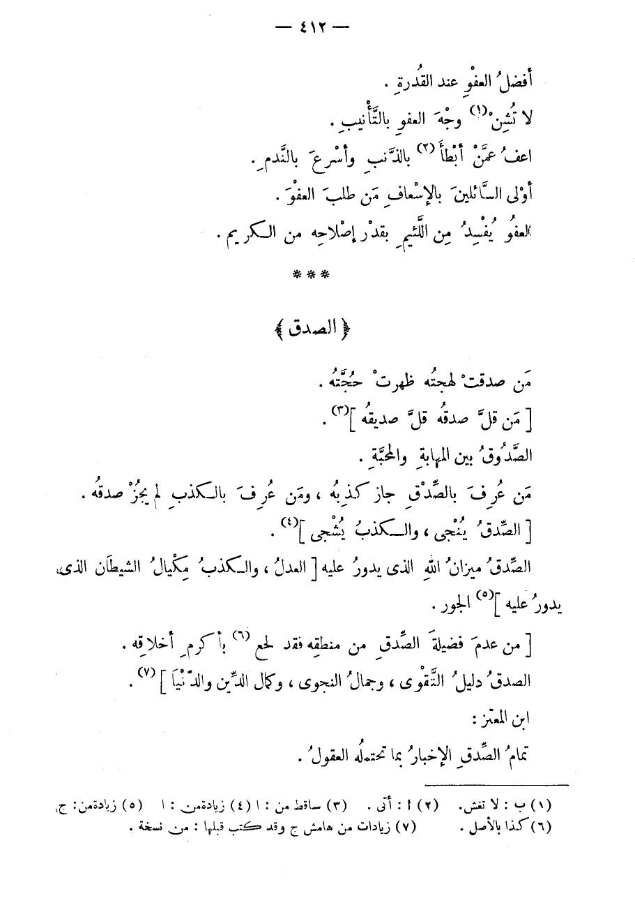 أفضل العفو عند المقدرة. لا تشن وجه العفو بالتأنيب. اعف عمن أبطأ بالذنب وأسرع بالندم. أولى السائلين بالإسعاف من طلب العفو. العفو يفسد من اللئيم بقدر إصلاحه من الكريم.