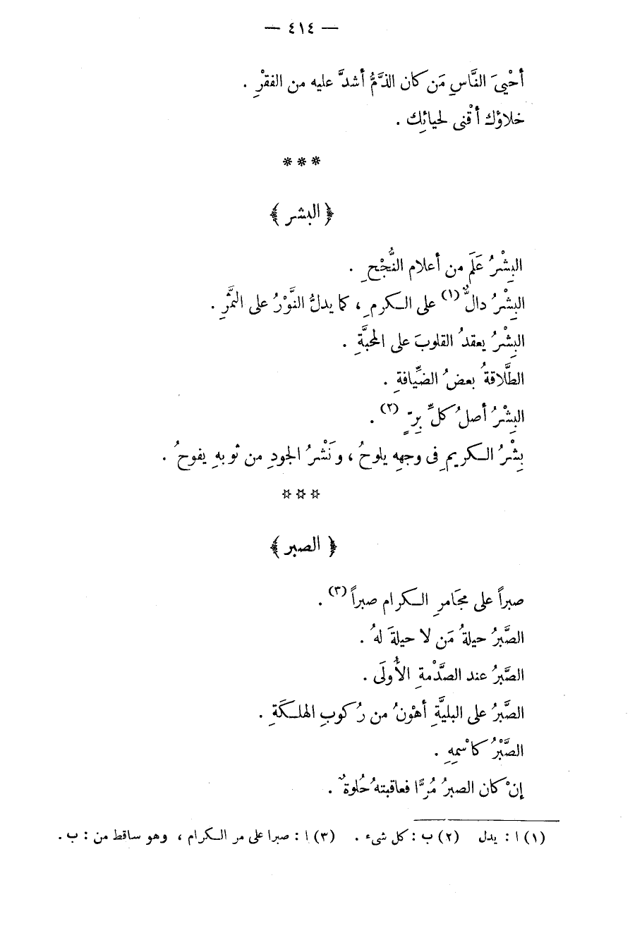 البشر علم من أعلام النجح. البشر دالٌ على الكرم، كما يدل النور على الثمر. البشر يعقد القلوب على المحبة. الطلاقة بعد الضيافة. البشر أصل كل برٍ. بشر الكريم في وجهه يلوح، ونشر الجود من ثوبه يفوح.