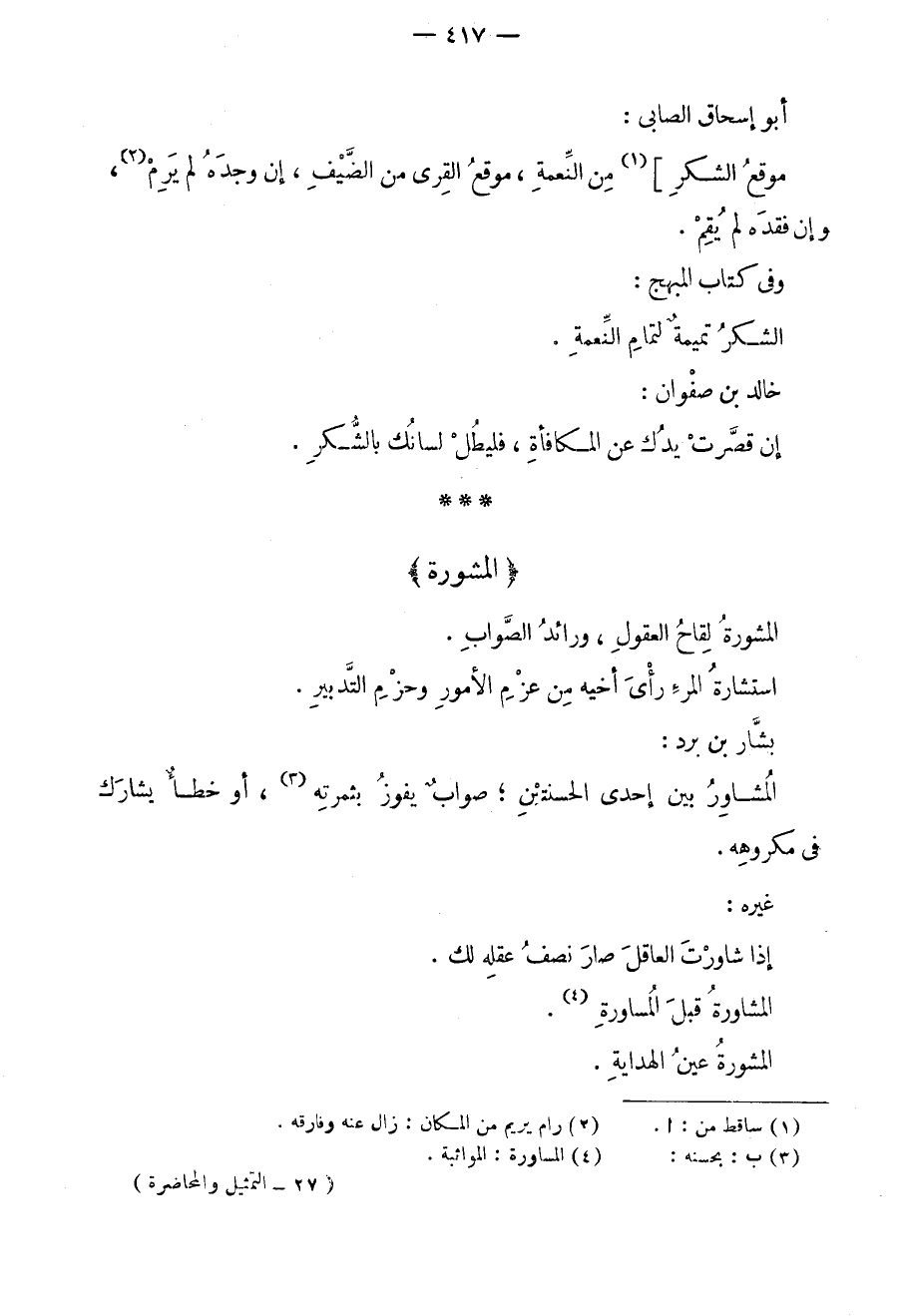 أبو إسحق الصابي: موقع الشكر من النعمة، موقع القرى من الضيف، إن وجده لم يرم، وإن فقده لم يقم. وفي كتاب المبهج: الشكر تميمةٌ لتمام النعمة. خالد بن صفوان: إن قصرت يداك عن المكافأة، فليطل لسانك بالشكر.