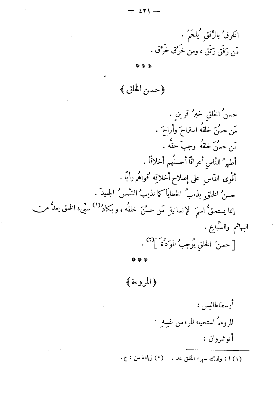 أرسطاطاليس: المروءة استحياء المرء من نفسه. أنوشروان: