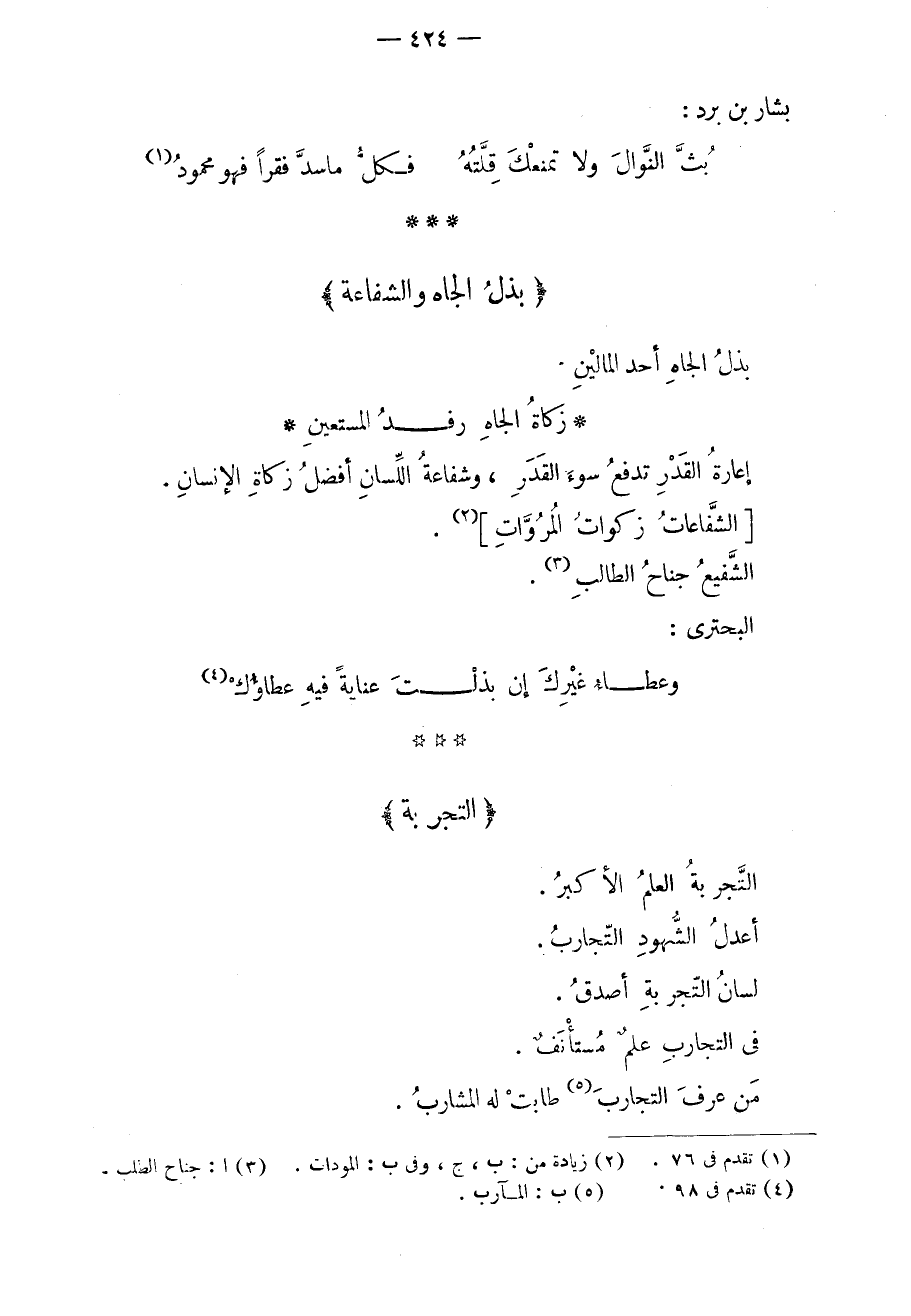 إعارة القًدْرِ تدفع سوء القَدَرِ، وشفاعة اللسان أفضل زكاة الإنسان. الشفاعات زكوات المروات. الشفيع جناح الطالب. البحتري: