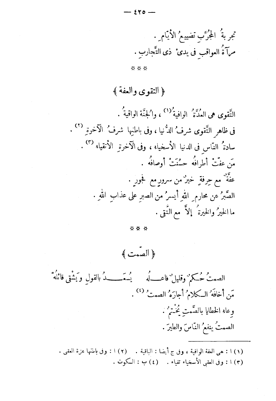 التقوى هي العدة الوافية، والجنة الواقية. في ظاهر التقوى شرف الدنيا، وفي باطنها شرف الآخرة. سادة الناس في الدنيا الأسخياء، وفي الآخرة الأتقياء. من عفت أطرافه حسنت أوصافه. عفةٌ مع حرفةٍ خيرٌ من سرورٍ مع فجورٍ. الصبر عن محارم الله أيسر من الصبر على عذاب الله. ما الخير والخيرة إلا مع التقى.
