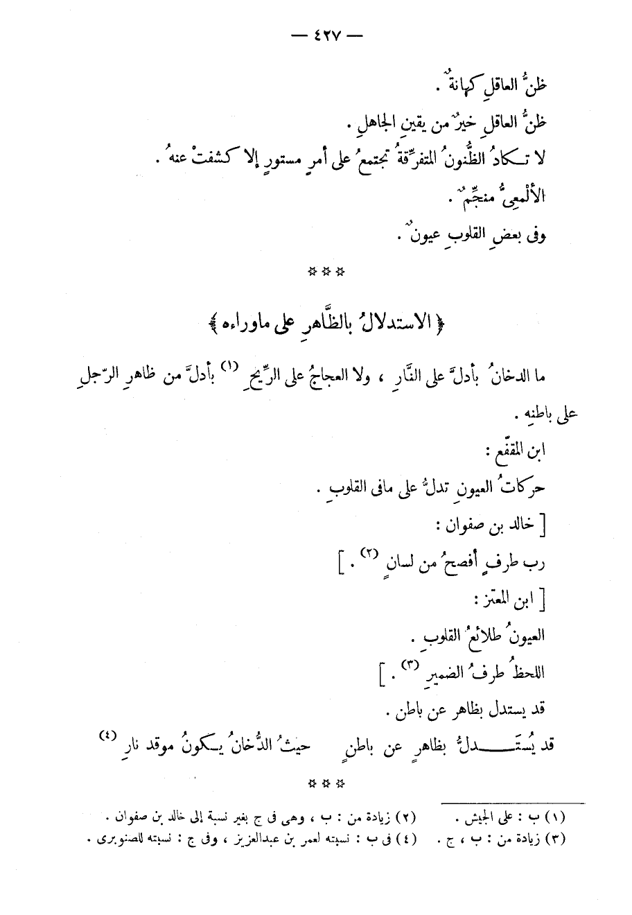 ما الدخان بأدل على النار، ولا العجاج على الريح بأدل من ظاهر الرجل على باطنه. ابن المقفع: حركات العيون تدل على ما في القلوب. خالد بن صفوان: ربّ طرفٍ أفصح من لسانٍ. ابن المعتز: العيون طلائع القلوب. اللحظ طرف الضمير. قد يستدل بظاهر عن باطن.