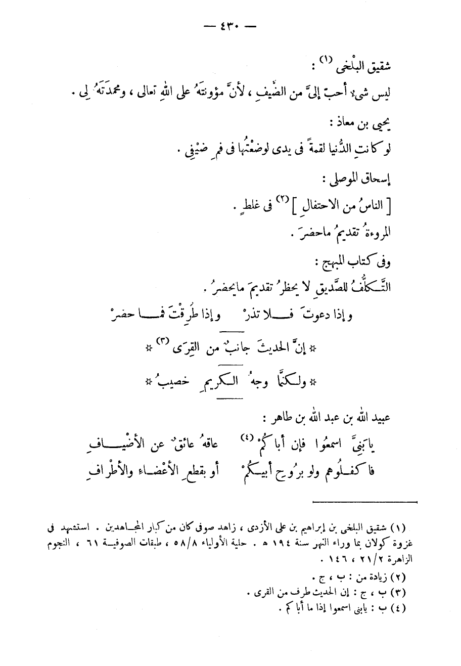 شقيق البلخي: ليس شيءٌ أحب إلي من الضيف، لأن مؤونته على الله تعالى، ومحمدته لي. يحيى بن معاذ: لو كانت الدنيا لقمةً في يدي لوضعتها في فم ضيفي. إسحق الموصلي: الناس من الاحتفال في غلطٍ. المروءة تقديم ما حضر. وفي كتاب المبهج: التكلف للصديق لا يحظر تقديم ما يحضر.