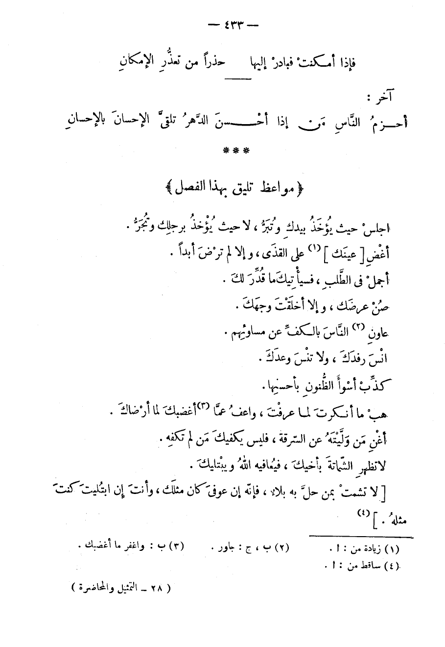 اجلس حيث يؤخذ بيدك وتبر، لا حيث يؤخذ برجلك وتجر. أغض عينك على القذى، وإلا لم ترض أبداً. أجمل في الطلب، فسيأتيك ما قدر لك. صن عرضك، وإلا أخلقت وجهك. عاون الناس بالكف عن مساوئهم. انس رفدك، ولا تنس وعدك. كذب أسوأ الظنون بأحسنها. هب ما أنكرت لما عرفت، واعف عما أغضبك لما أرضاك. أغن من وليته عن السرقة، فليس يكفيك من لم تكفه. لا تظهر الشماتة بأخيك، فيعافيه الله ويبتليك. لا تشمت بمن حلّ به بلاءٌ، فإنه إن عوفي كان مثلك، وأنت إن ابتليت كنت مثله.