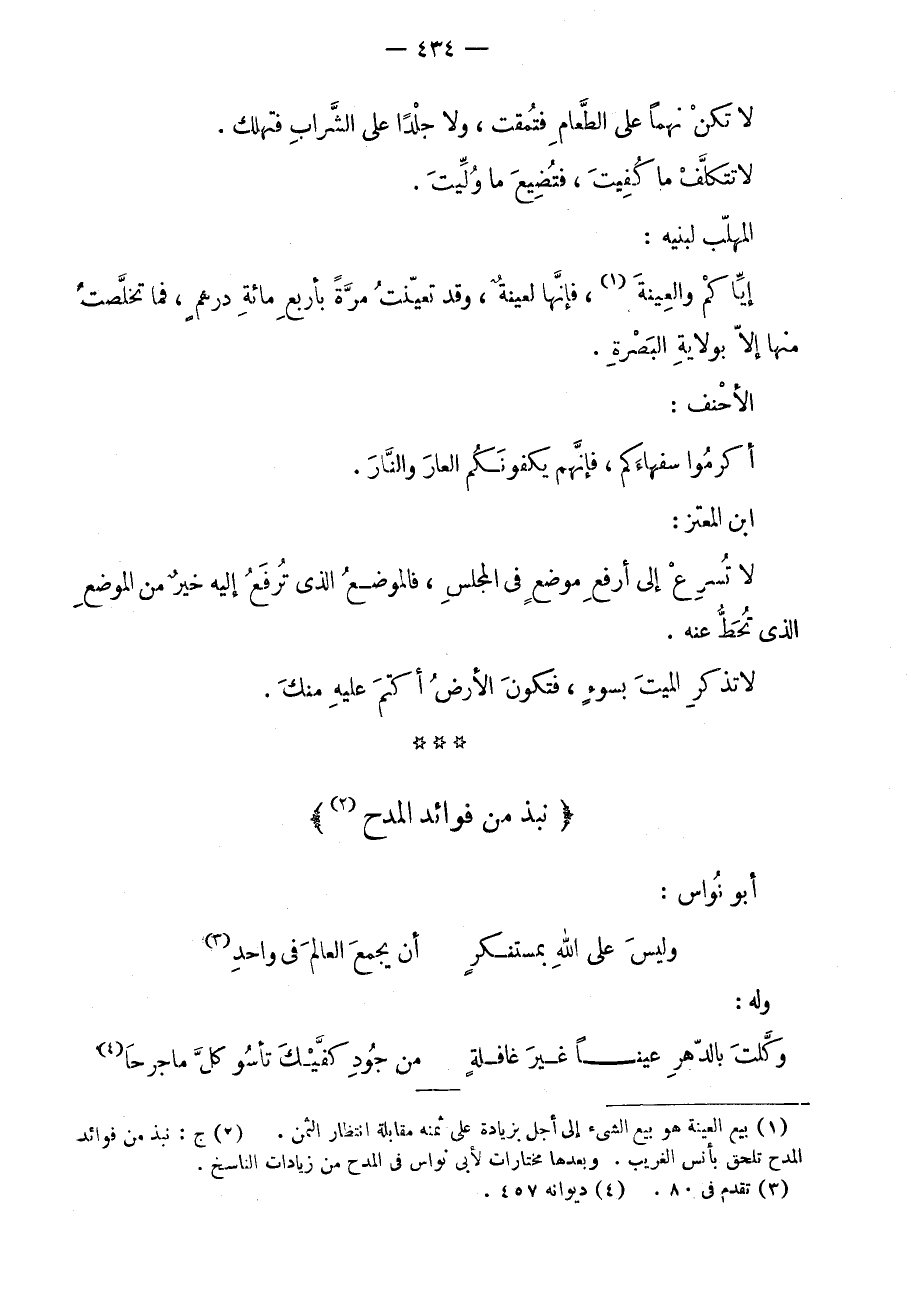 لا تكن نهماً على الطعام فتمقت، ولا جلداً على الشراب فتهلك. لا تتكلف ما كفيت، فتضيع ما وليت. المهلب لبنيه: إياكم والعينة، فإنها لعينةٌ، وقد تعينت مرةً بأربع مائة درهمٍ، فما تخلصت منها إلا بولاية البصرة.