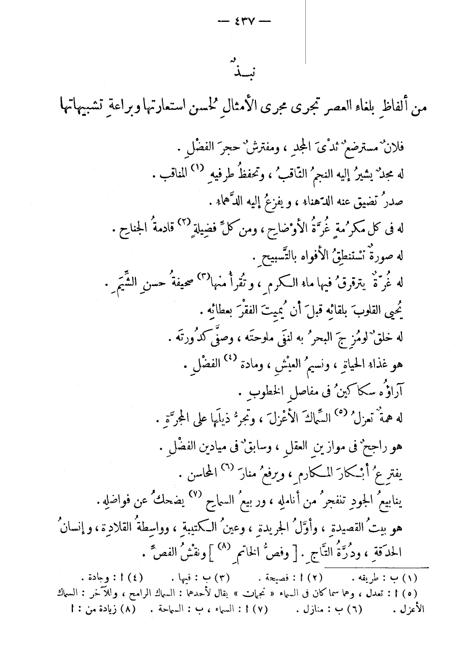 فلانٌ مسترضعٌ ثدي المجد، ومفترشٌ حجر الفضل. له مجدٌ يشير إليه النجم الثاقب، وتحفظ طرفيه المناقب. صدر تضيق عنه الدهناء، ويفزع إليه الدهماء. له في كل مكرمةٍ غرة الأوضاح، ومن كل فضيلةٍ قادمة الجناح. له صورةٌ تستنطق الأفواه بالتسبيح. له غرةٌ يترقرق فيها ماء الكرم، وتقرأ منها صحيفة حسن الشيم. يحيي القلوب بلقائه قبل أن يميت الفقر بعطائه. له خلقٌ لو مزج البحر به لنفى ملوحته، وصفى كدورته. هو غذاء الحياة، ونسيم العيش، ومادة الفضل. آراؤه سكاكين في مفاصل الخطوب. له همةٌ تعزل السماك الأعزل، وتجر ذيلها على المجرة. هو راجحٌ في موازين العقل، وسابقٌ في ميادين الفضل. يفترع أبكار المكارم، ويرفع منار المحاسن. ينابيع الجود تنفجر من أنامله، وربيع السماح يضحك عن فواضله. هو بيت القصيد، وأول الجريدة، وعين الكتيبة، وواسطة القلادة، وإنسان الحدقة، ودرة التاج، وفص الخاتم، ونقش الفص.