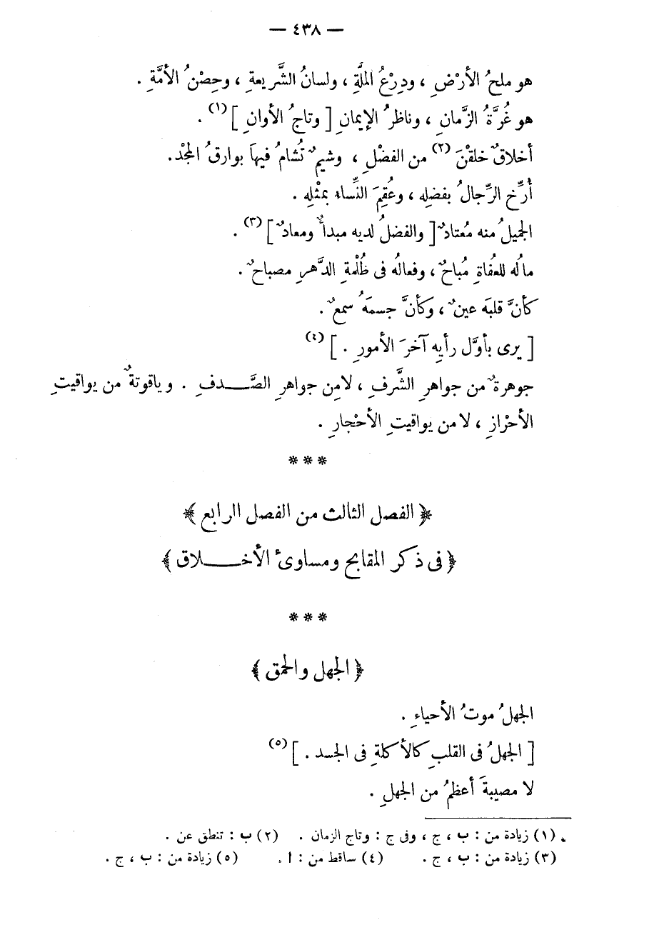 هو ملح الأرض، ودرع الملة، ولسان الشريعة، وحصن الأمة. هو غرة الزمان، وناظر الإيمان، وتاج الأوان. أخلاقٌ خلقن من الفضل، وشيمٌ تشام فيها بوارق المجد. أرخ الرجال بفضله، وعقم النساء بمثله. الجميل منه معتادٌ، والفضل لديه مبدأٌ ومعادٌ. ما له للعفاة مباحٌ، وفعاله في ظلمة الدهر مصباحٌ. كأن قلبه عينٌ، وكأن جسمه سمعٌ. يرى بأول رأيه أواخر الأمور. جوهرةٌ من جواهر الشرف، لا من جواهر الصدف، وياقوتةٌ من يواقيت الأحراز، لا من يواقيت الأحجار.